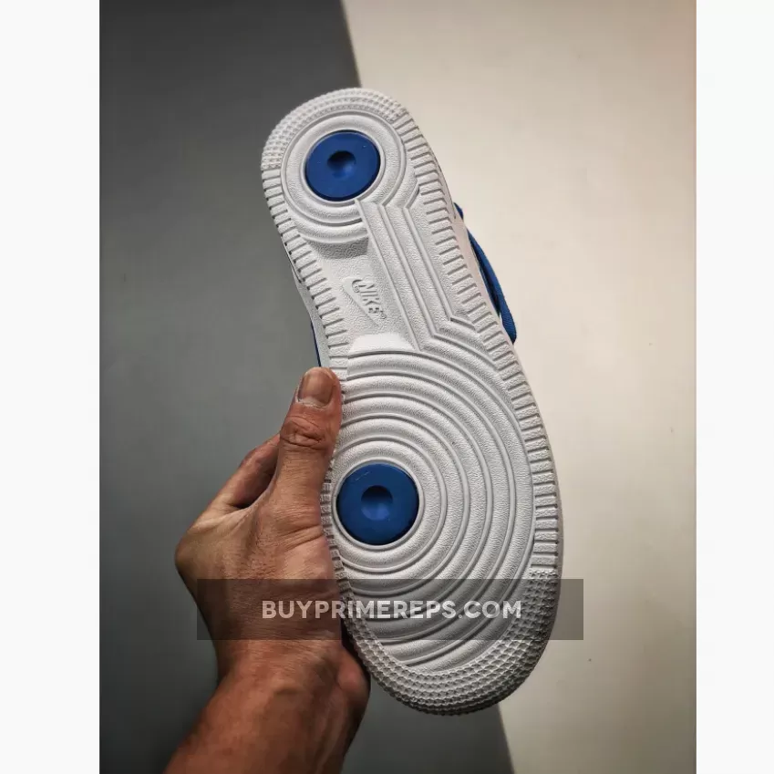 One of the standout features of this special edition Air Force 1 is the striking blue Swoosh branding that adorns both sides of the shoe. The blue accents also extend to the embroidered mini Swooshes on the lateral toe cap, the heel tab, and the hook-and-loop Velcro ankle flaps, adding a pop of color to the otherwise clean white upper. Additionally, the white tongue tabs feature bold blue “Nike Air Force” branding with an oversized number “1,” further emphasizing the shoe’s lineage and significance.