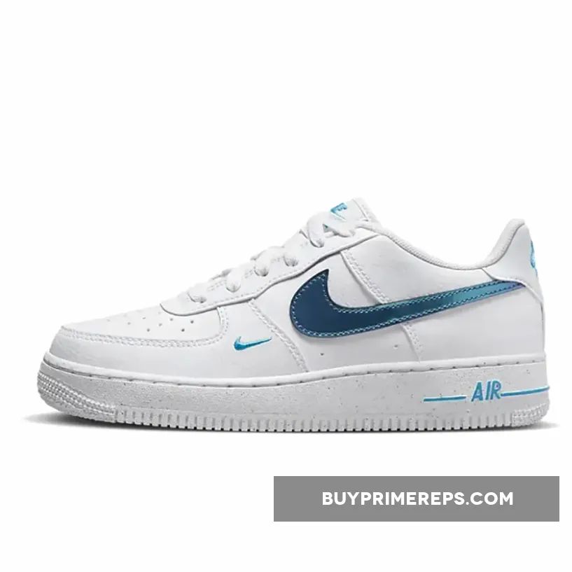 Introducing the Nike Air Force 1 Low GS White Iridescent Blue, a stunning iteration of the iconic Air Force 1 design. This smaller-sized release is perfect for young sneaker enthusiasts looking to make a stylish statement.