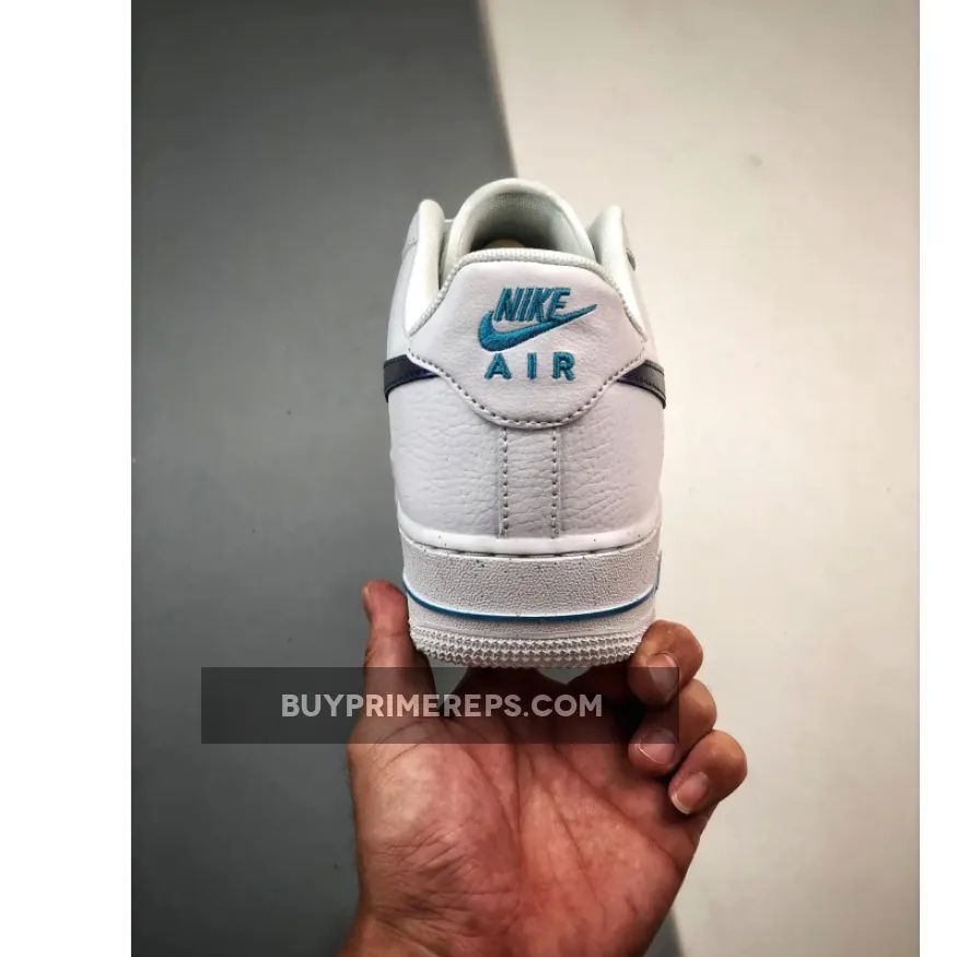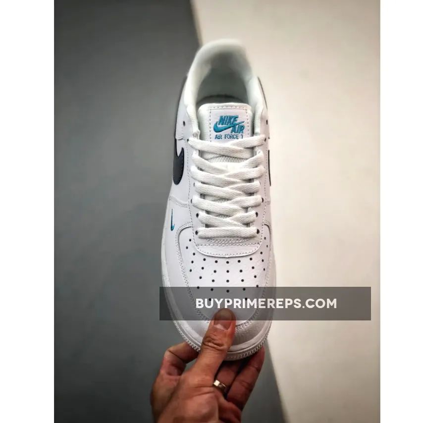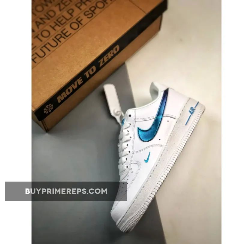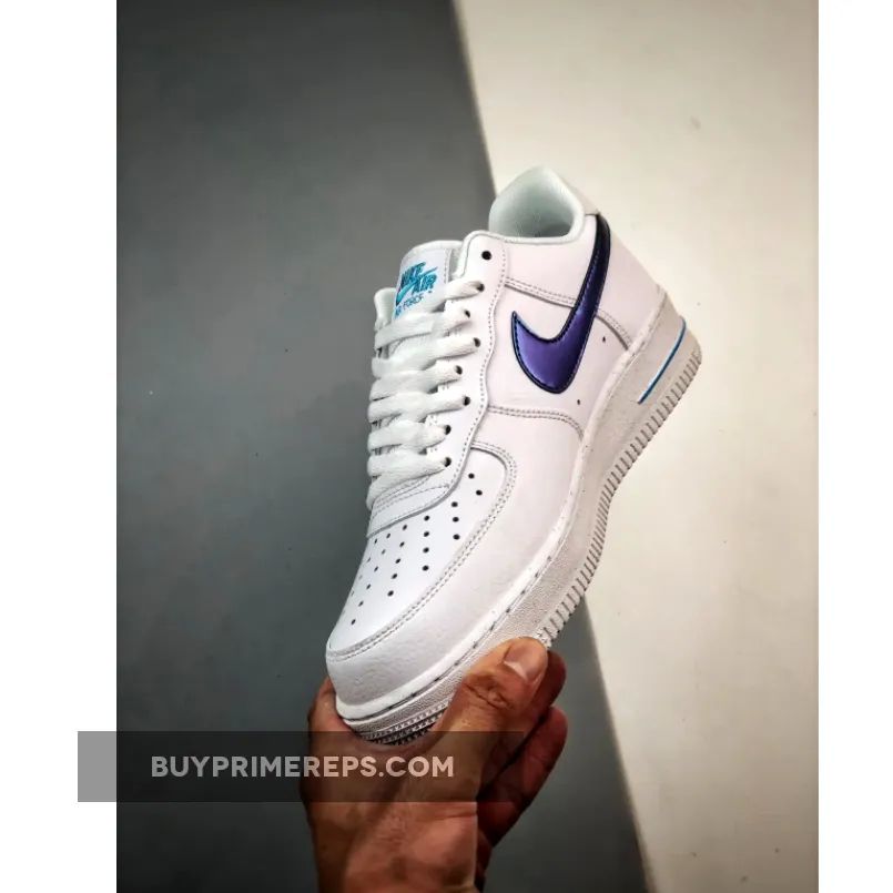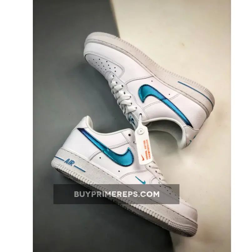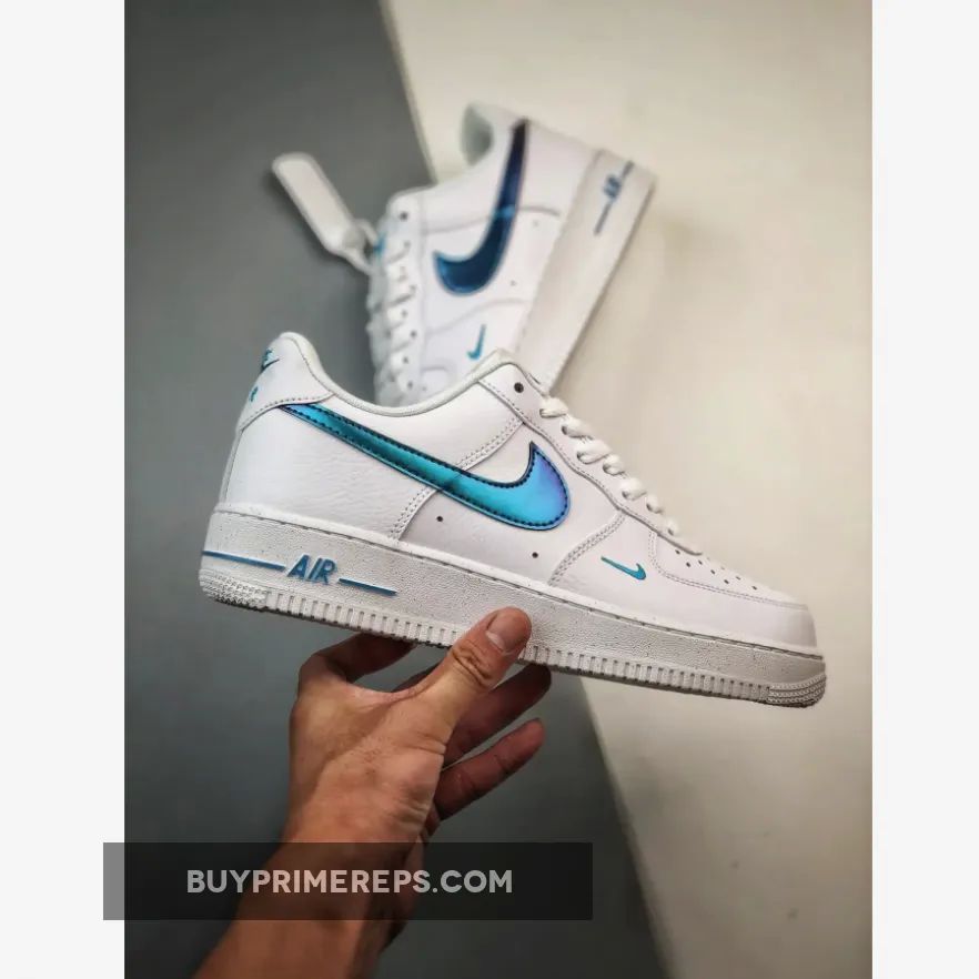 The focal point of this shoe is its iridescent sapphire blue Nike Swoosh, which beautifully contrasts against the smooth white leather upper. The iridescent finish gives the Swoosh a mesmerizing, ethereal quality that catches the light from every angle. It’s a truly eye-catching detail that sets this Air Force 1 apart from the rest.