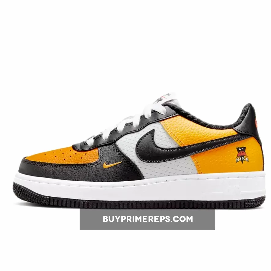 Introducing the Nike Air Force 1 ‘Jersey Mesh’ in a striking White/Gold-Black colorway. This grade-school edition pays homage to basketball heritage with its classic design and subtle nods to the sport. The sneaker features a unique construction, with white jersey mesh material used on the mid-panels, creating a distinctive look and adding a textural element to the shoe. The toe box and heel are adorned with luxurious golden tumbled leather, while the overlays and iconic Swoosh branding are crafted from sleek black leather, enhancing the premium feel of the shoe.