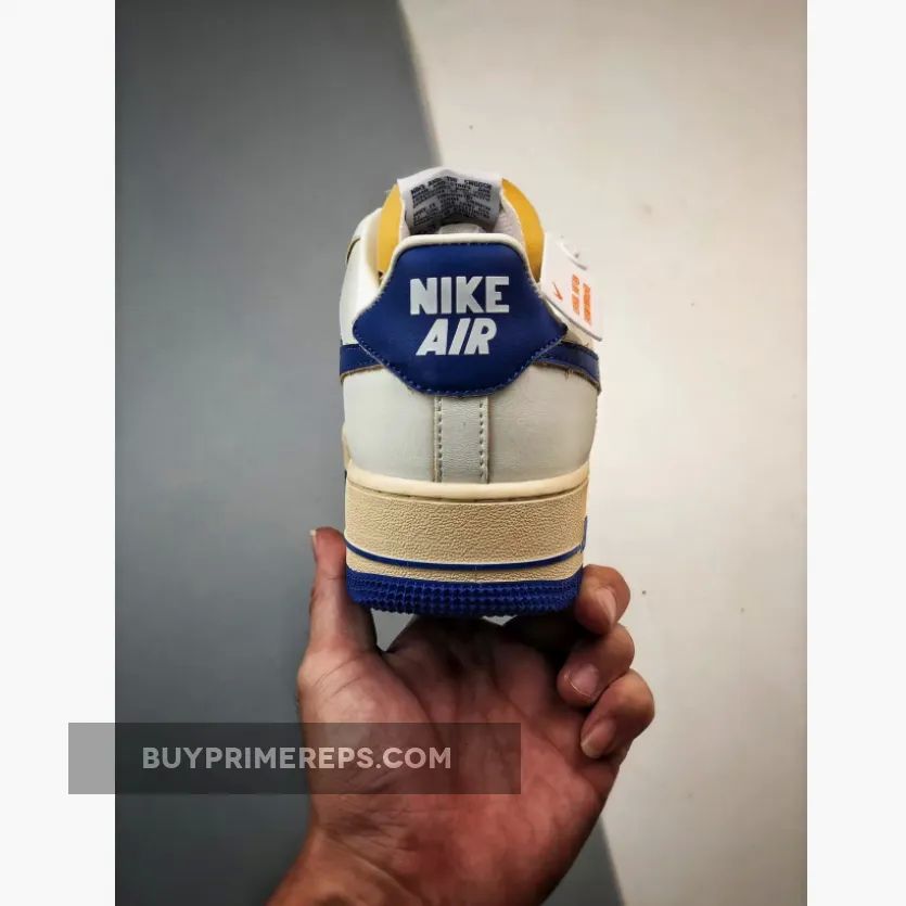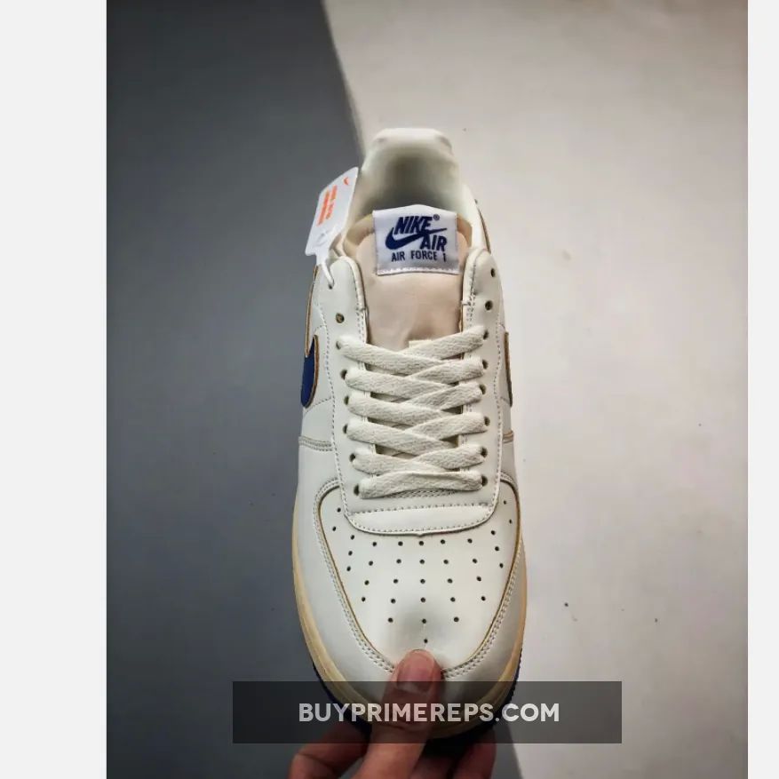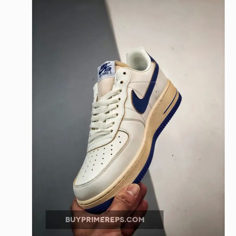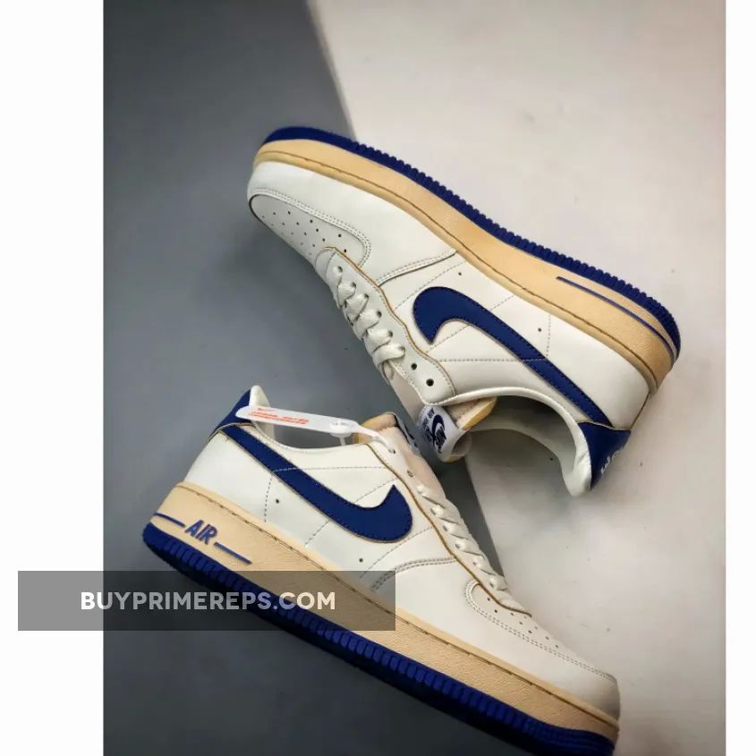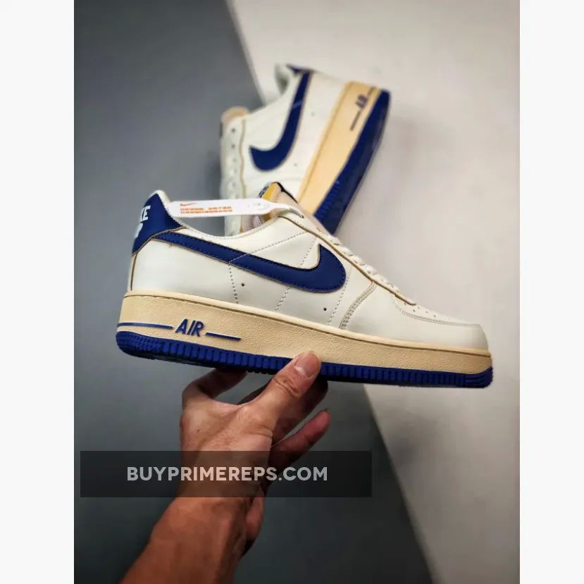 Constructed with vintage white leathers and exposed edges, the Air Force 1 Low “Athletic Department” exudes a charmingly retro feel. The retro nylon tongue flaps, antique heel counter logos, and extensive aged-look tinting on the midsoles all contribute to the vintage aesthetic, while the mid-panel back’s bolstered stitching and omitted quarter panels give it a more contemporary look. The deep royal blue overlays at the Swoosh and heel tie in perfectly with the rubber outsole and supplementary brand insignia, adding a pop of color to the predominantly white sneaker.