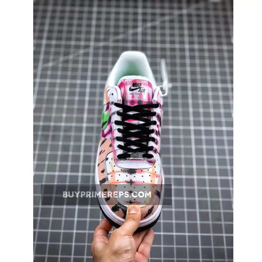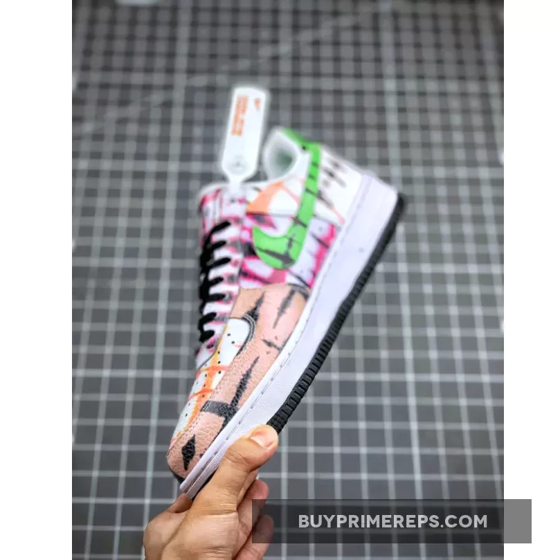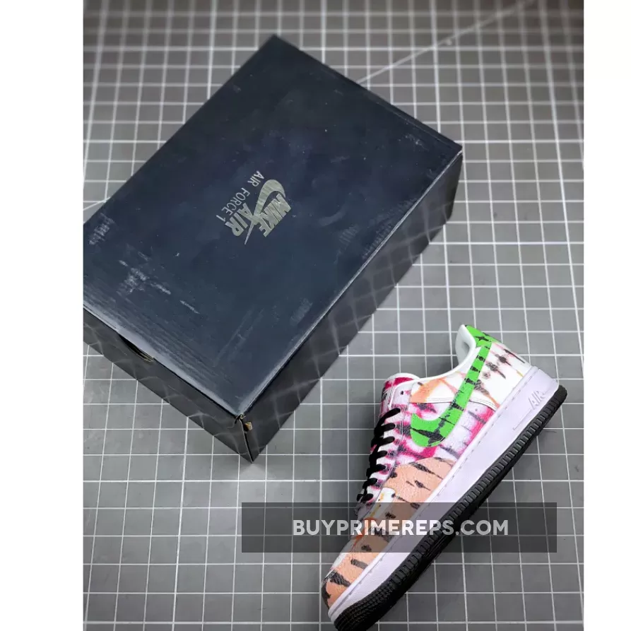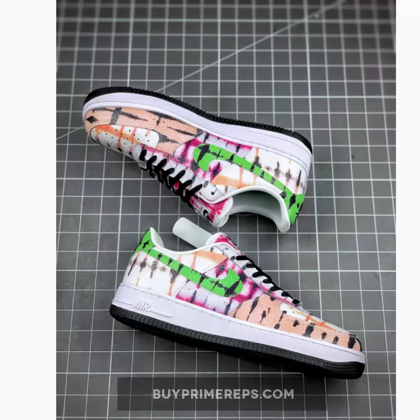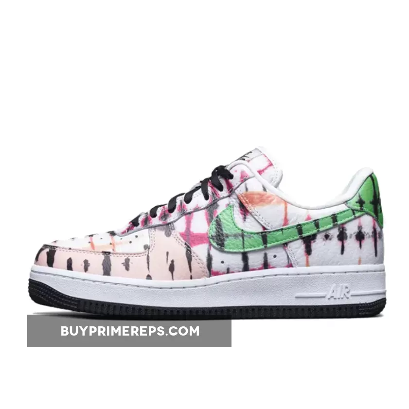 Constructed with durable canvas material, the upper of the Air Force 1 07 Black Tie Dye features a mesmerizing tie-dye pattern in a range of vibrant colors. The combination of white, green strike, washed coral, and black creates a visually striking and eye-catching aesthetic. The classic paneling of the Air Force 1 is maintained, while the iconic Nike Swoosh logo is prominently displayed on both the lateral and medial sides of the shoe.