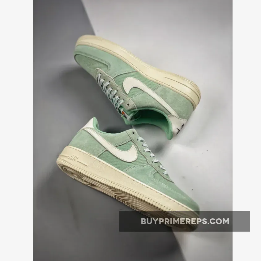 The Air Force 1 Low “Enamel Green” features a delicate pastel mint hue that covers the entire upper of the shoe. The upper is made from a thick canvas material, giving it a durable and high-quality feel. The overlays on the shoe have a more coarse and defined texture, adding an interesting visual element to the design.