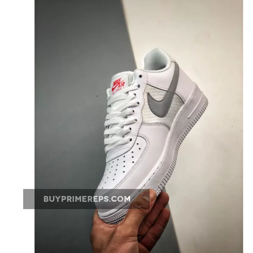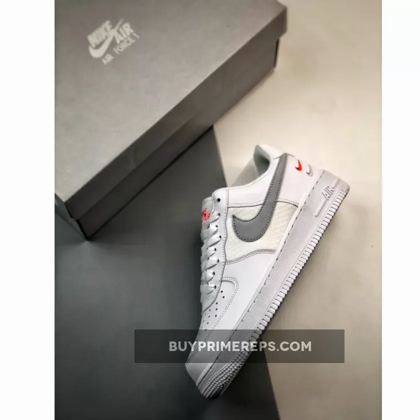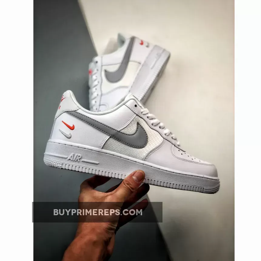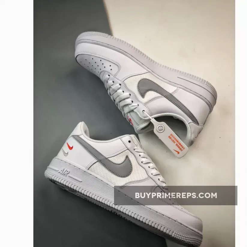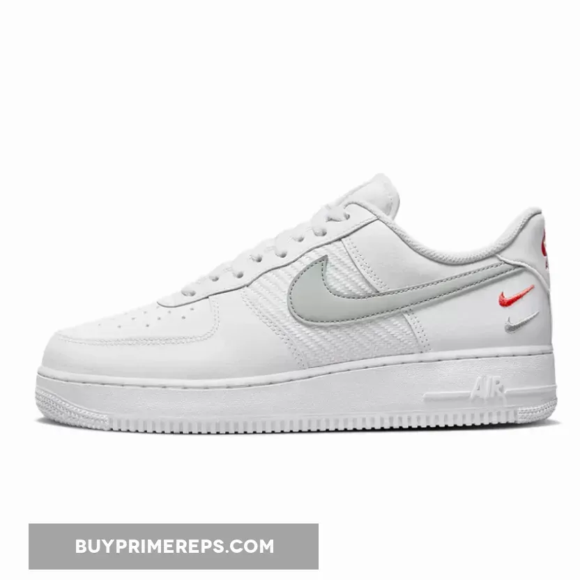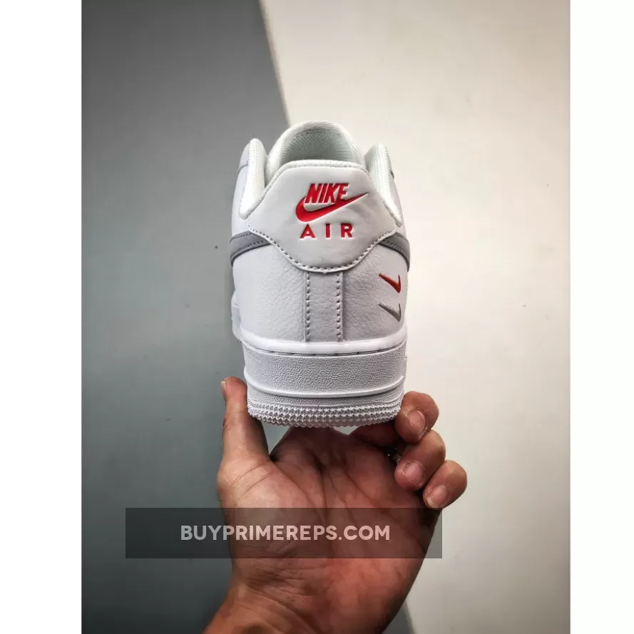 One of the standout features of the Nike Air Force 1 Low Triple Swoosh White is the presence of three Swoosh logos. On the lateral and medial sides of the shoe, a grey Nike Swoosh shoots across, adding a subtle yet eye-catching contrast to the overall white design. Additionally, mini embroidered Nike Checks in red-orange and off-white are placed on the heel, further enhancing the visual appeal of the shoe.