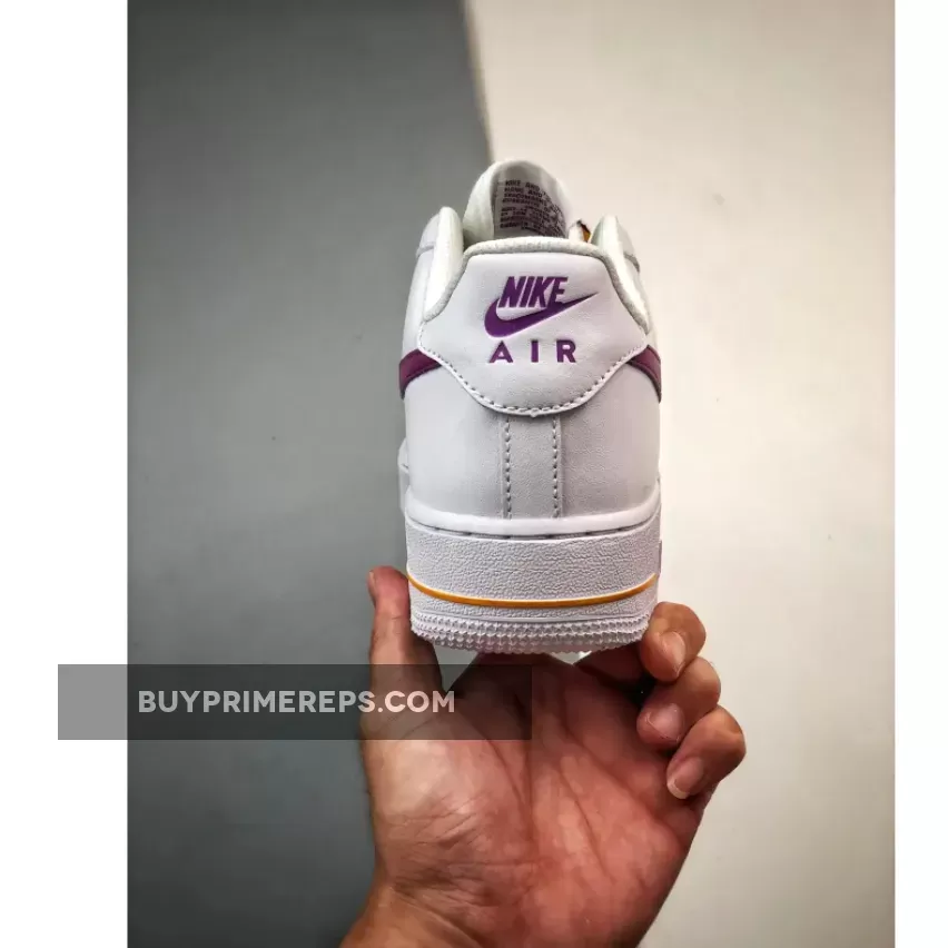 The Air Force 1 Low EMB “Lakers” sits atop a classic white AF1 rubber sole, providing comfort and durability. The midsole features the iconic “Air” branding in a matching yellow hue, further enhancing the Lakers-inspired aesthetic.