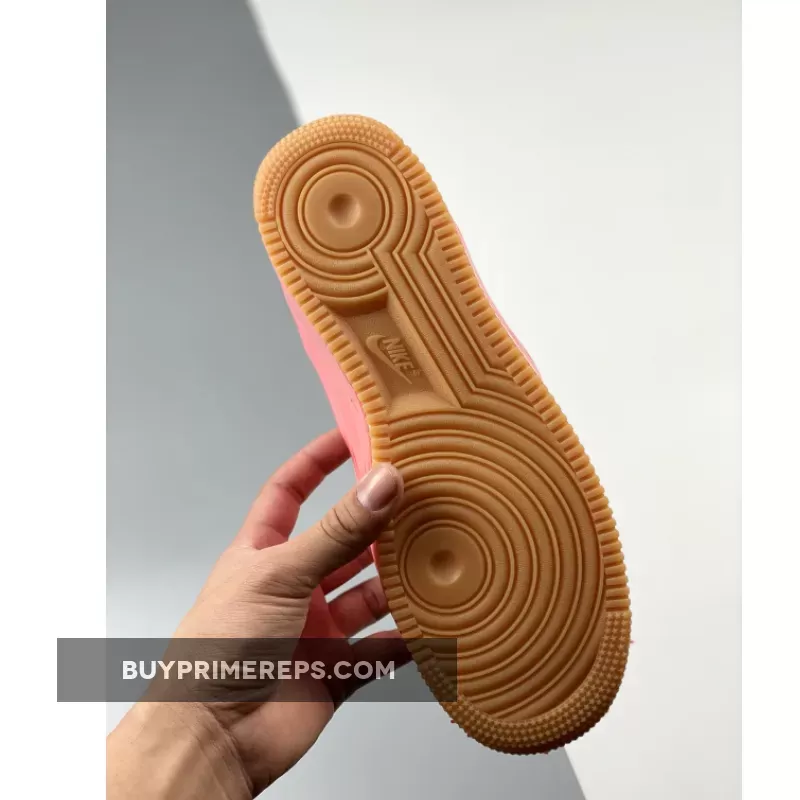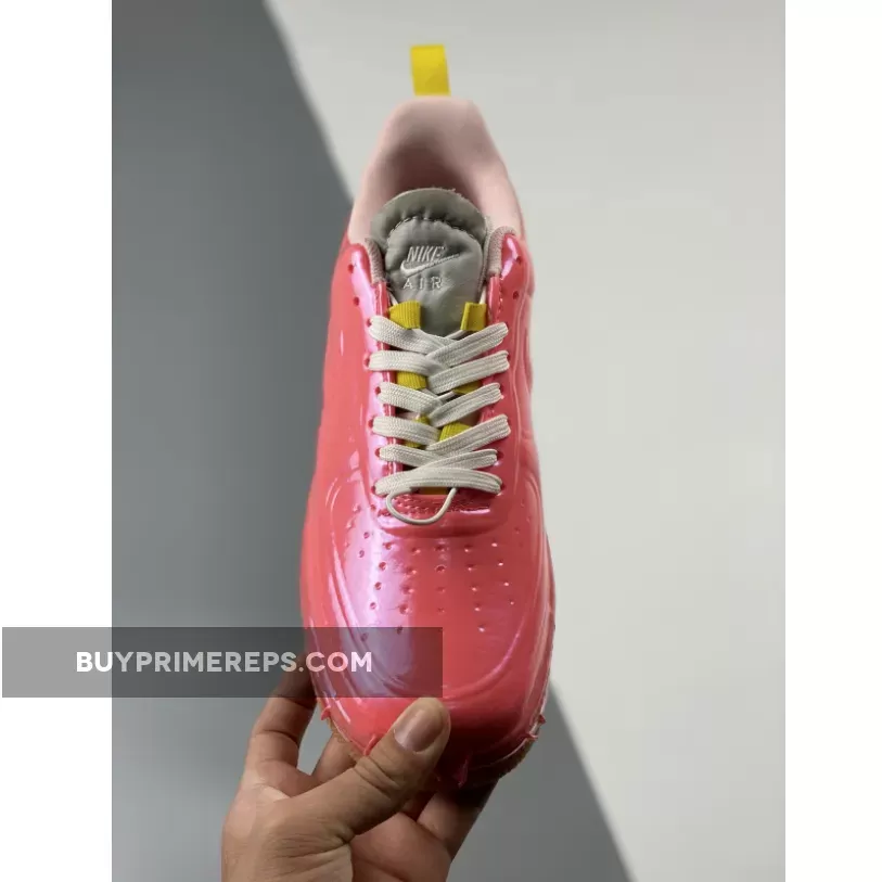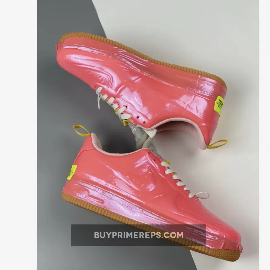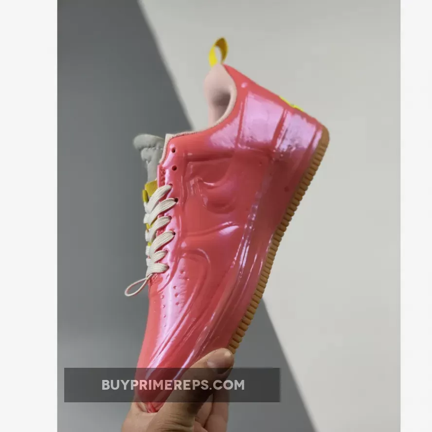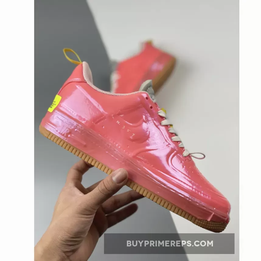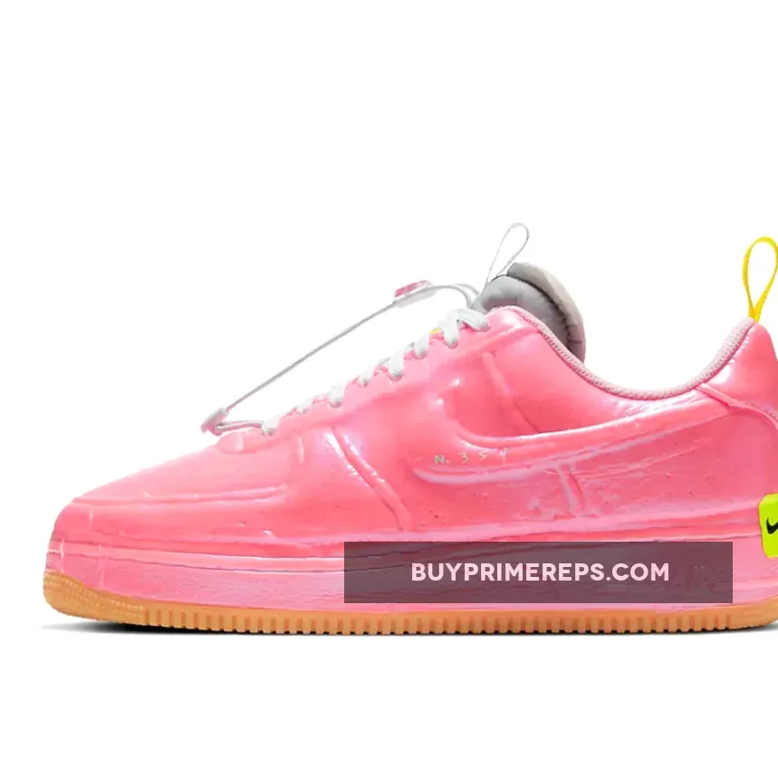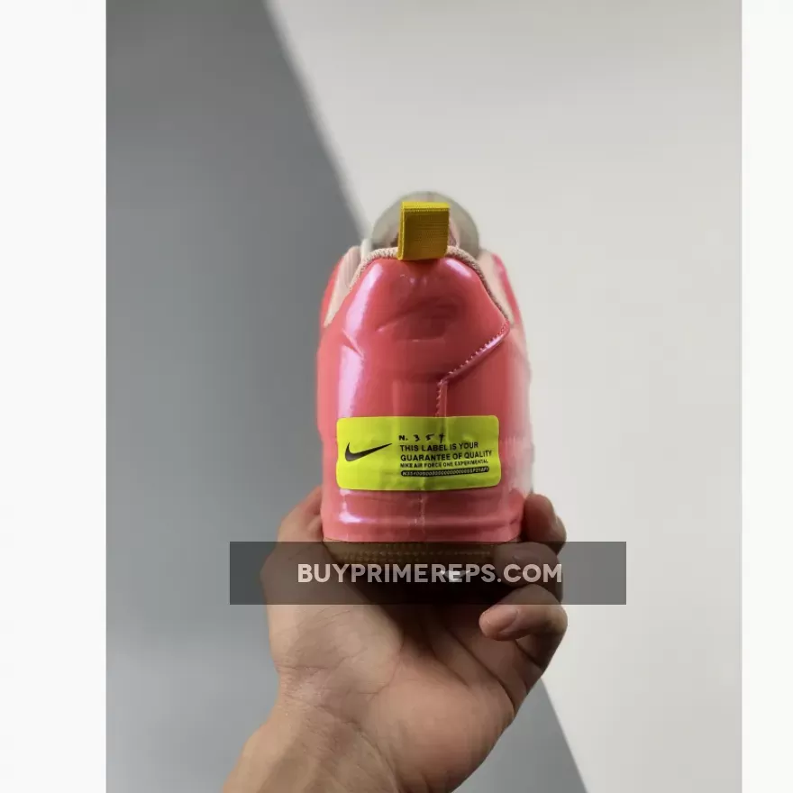 The standout feature of the Nike Air Force 1 Low Experimental ‘Racer Pink’ is the gummy plastic-like mold that covers the entire shoe, from heel to toe, in a vibrant Racer Pink colorway. This unique coating gives the sneaker a futuristic and edgy look, setting it apart from other Air Force 1 iterations. The only parts left untouched by the pink mold are the sock liner and the gum rubber outsole, which provide a subtle contrast to the vibrant upper.