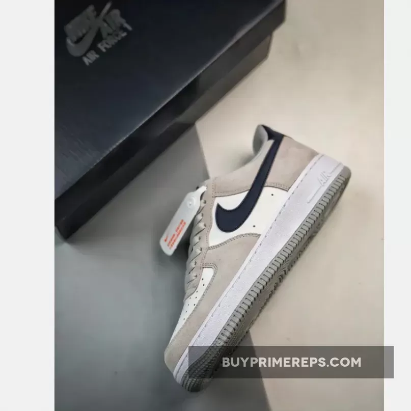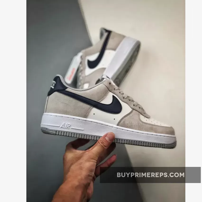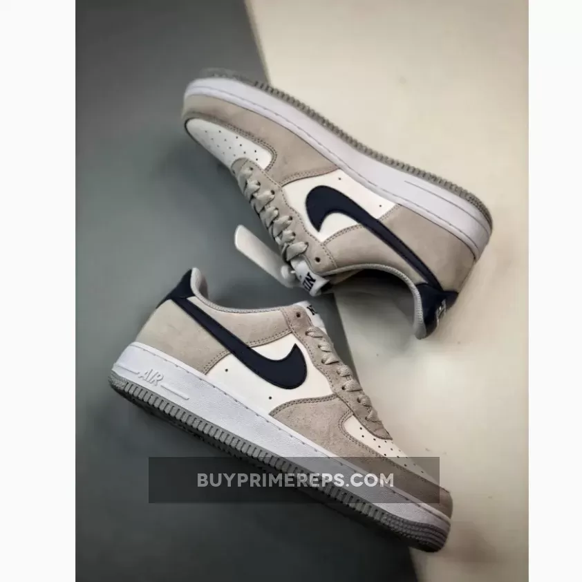 To complement the muted color scheme, the Nike Swoosh, heel overlay, and tongue tag branding are all rendered in a rich navy blue. This subtle pop of color adds a touch of elegance to the shoe, while still maintaining its classic and timeless appeal. The flat laces are also in the same muted hue, further enhancing the overall aesthetic.