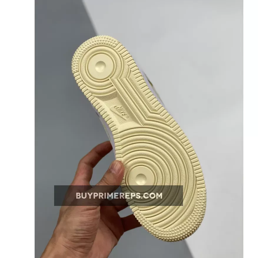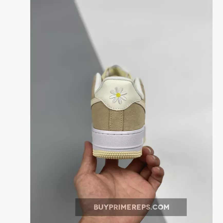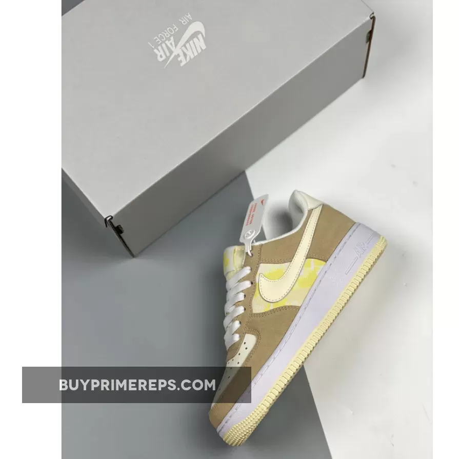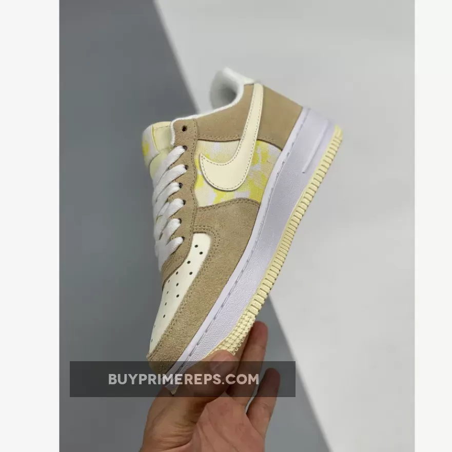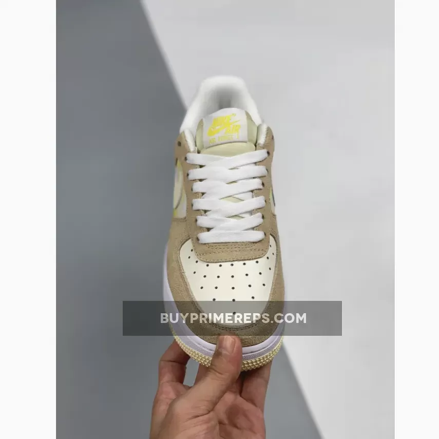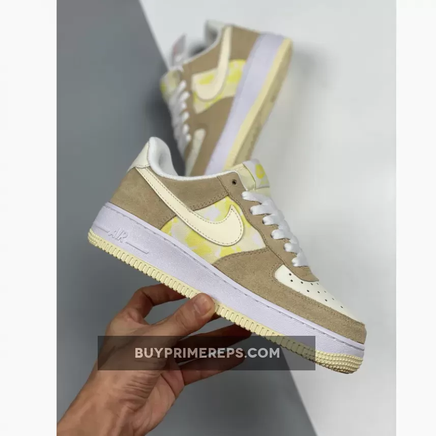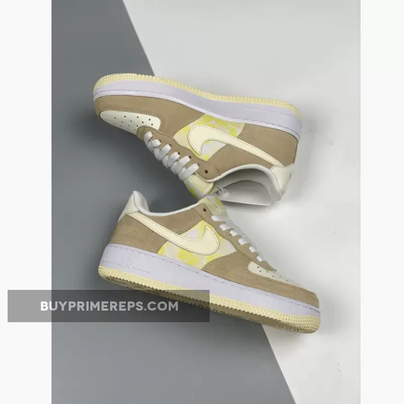 Unlike most Air Force 1s that feature smooth leather panels, the Lemon Drop edition opts for a more textured look with fuzzy suede panels. The upper is adorned in earthy tones of cream, beige, and sail, providing a neutral base for the standout details. The quarter panel is adorned with faint lemon graphics, adding a playful touch to the overall design.