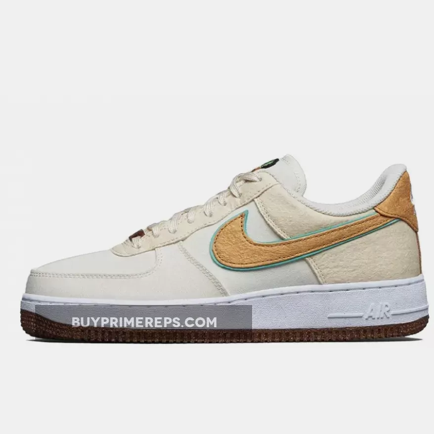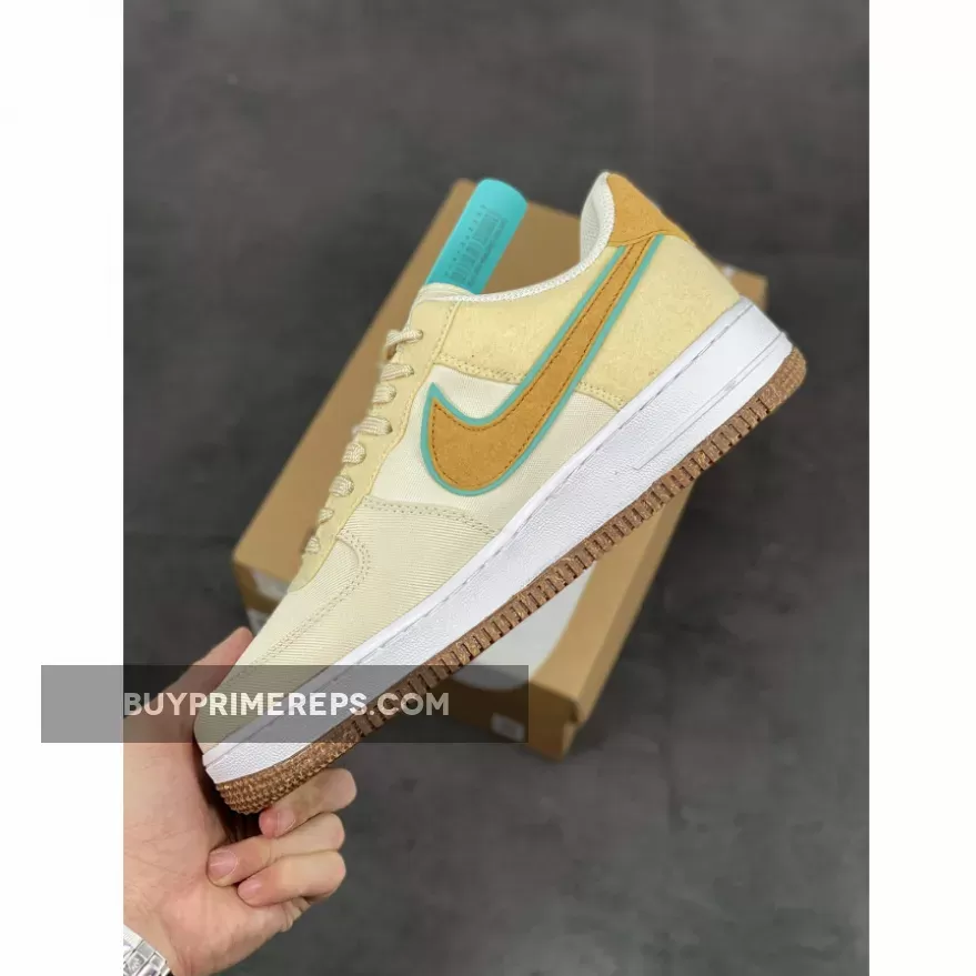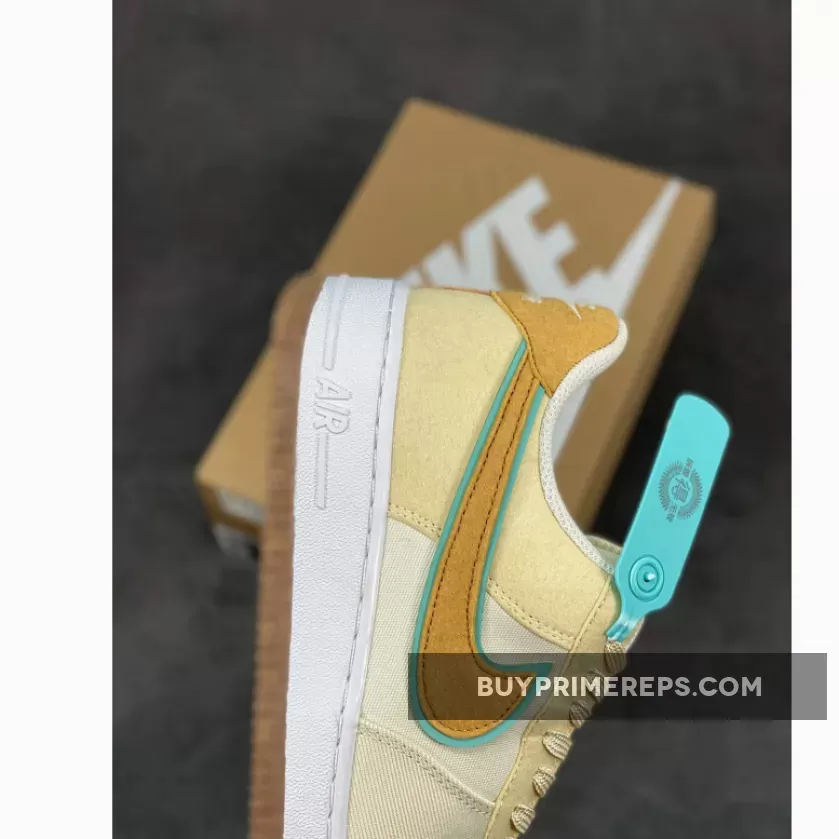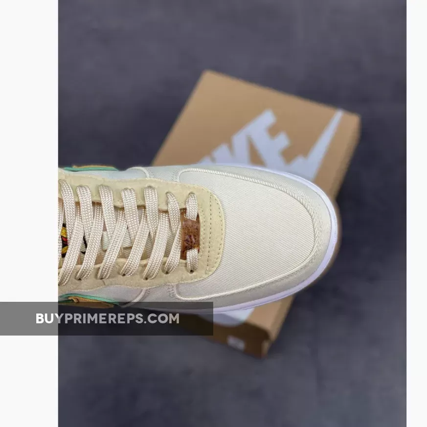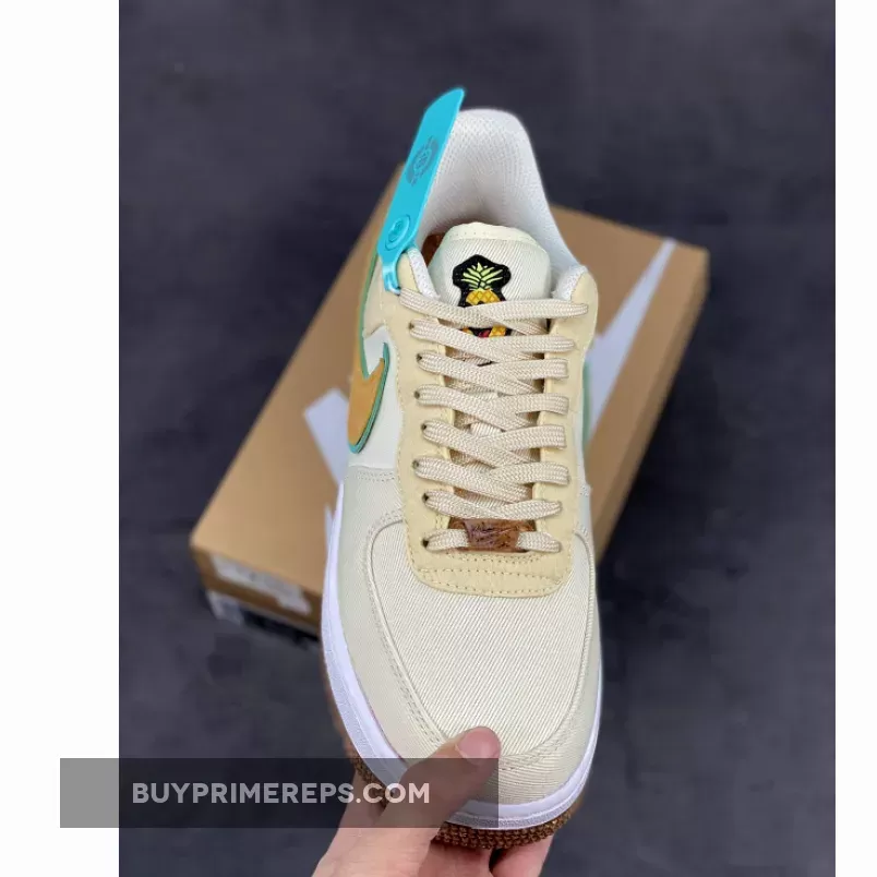 The Low Happy Pineapple Coconut Milk Nike Air Force 1 features a canvas upper in a creamy Coconut Milk color, giving it a clean and versatile look. The shoe is accented with pops of green and Metallic Gold, adding a touch of vibrancy and luxury to the design.