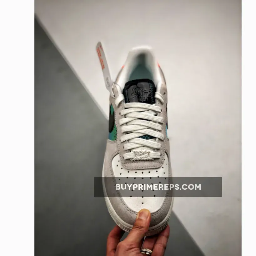The rest of the sneaker takes on a more neutral color palette, with soft suede panels in a light grey shade working around the toe cap and up the lace unit. The toebox is covered in creamy leather, which is finished with the signature perforation holes for breathability and to give the shoe that classic Air Force 1 look. Black Swooshes grace the sidewalls of this multicolored cream Air Force 1, adding a touch of contrast to the design. The tongue is also black, further mixing up the look of the shoe.