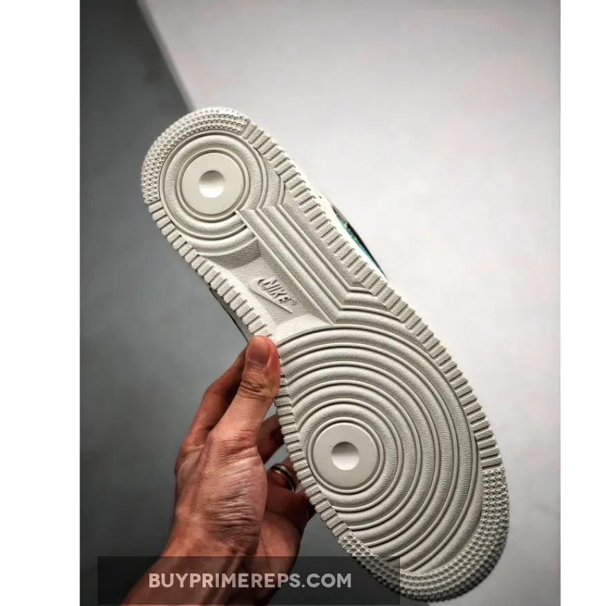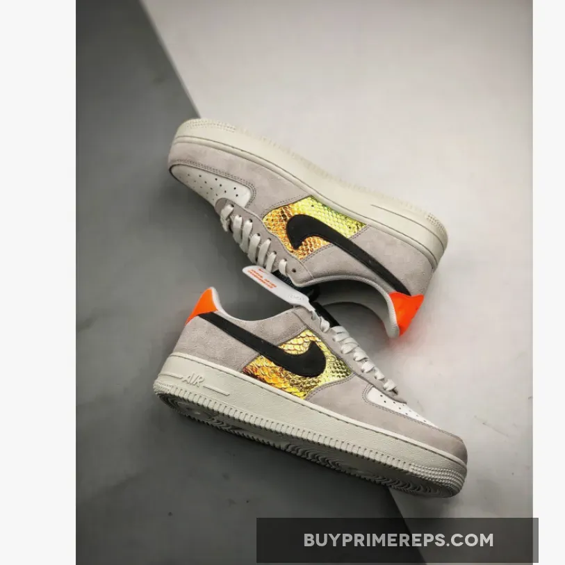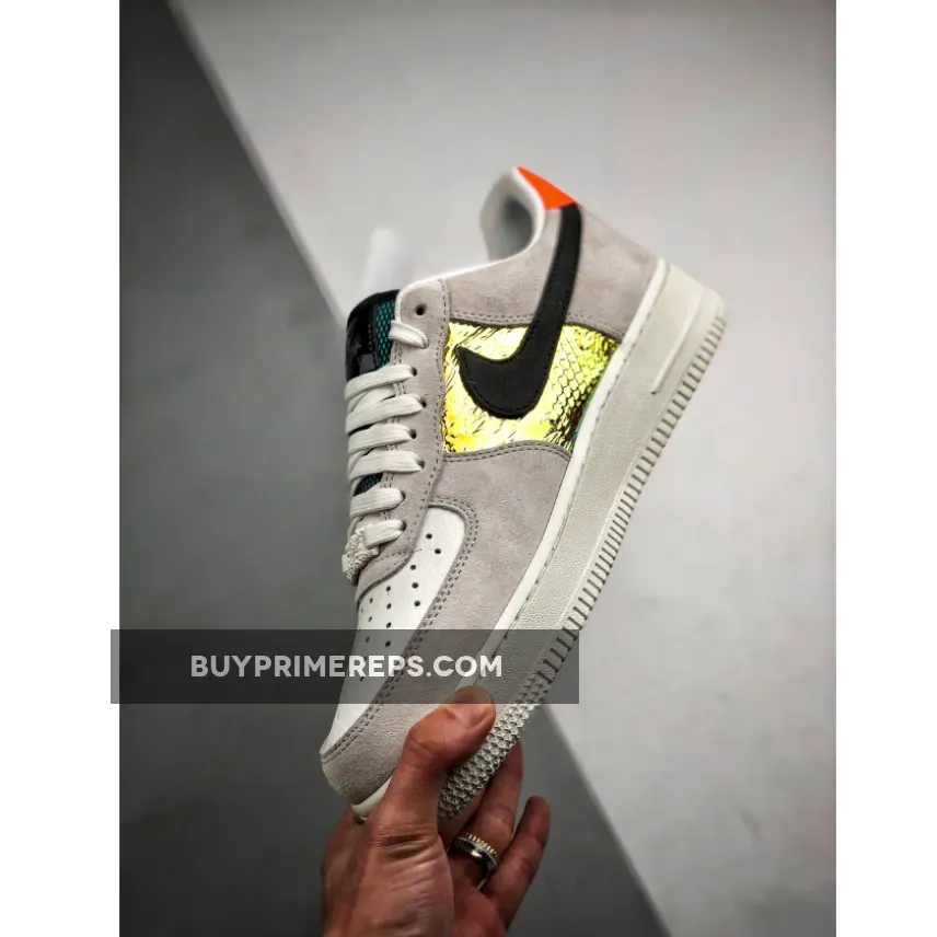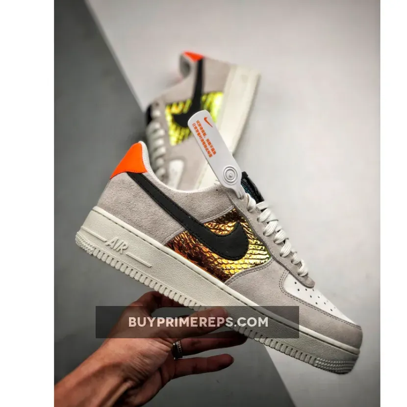 The standout feature of this Air Force 1 is the shimmering, iridescent panels on the sidewalls. These panels are finished with a snakeskin print and a textured overlay, creating a unique and eye-catching look. The panels change color slightly in the light, resulting in a mesmerizing rainbow effect. Vibrant teal and burnt orange tones are featured in the iridescent panels, matching the bold orange heel panels that stand out on the back of the shoe.