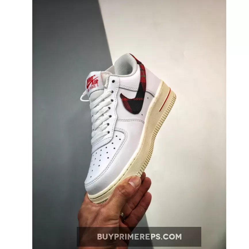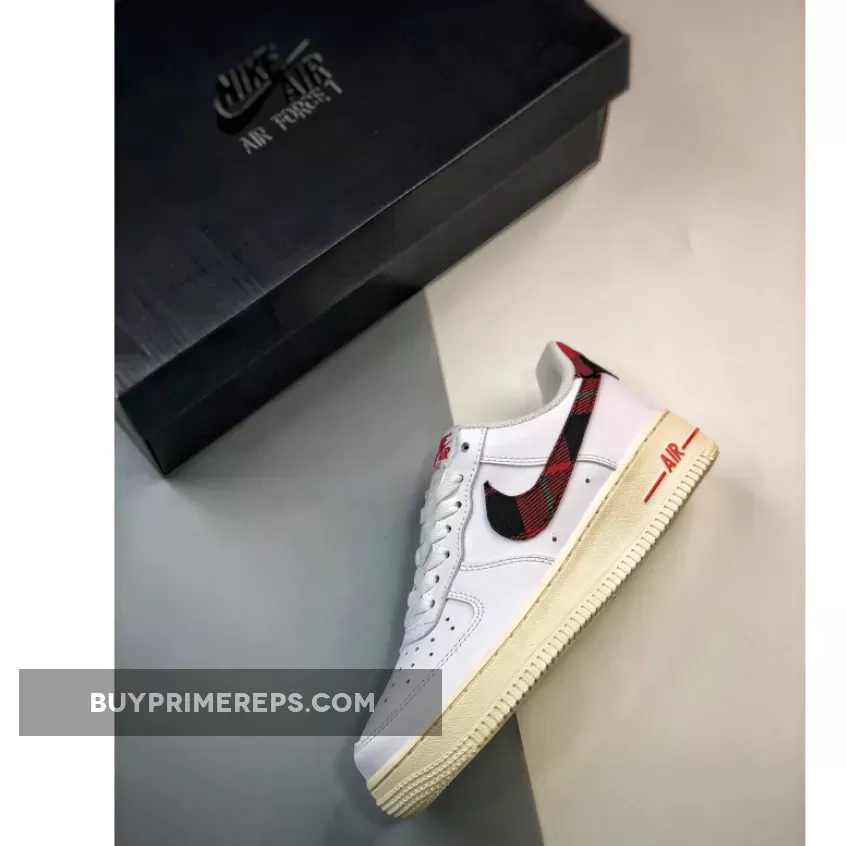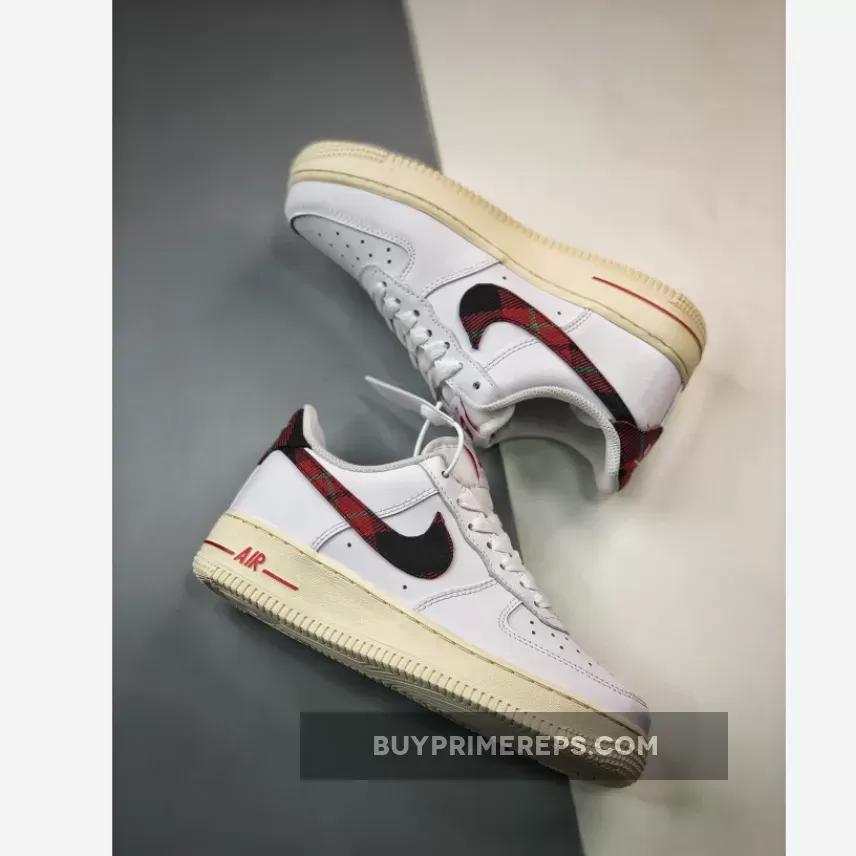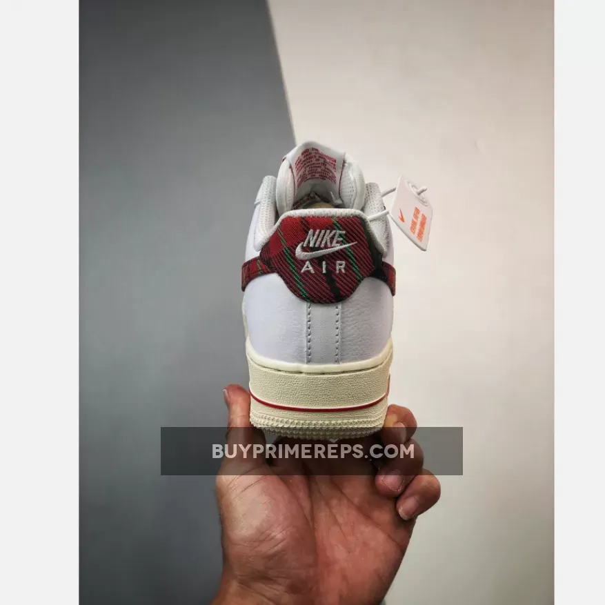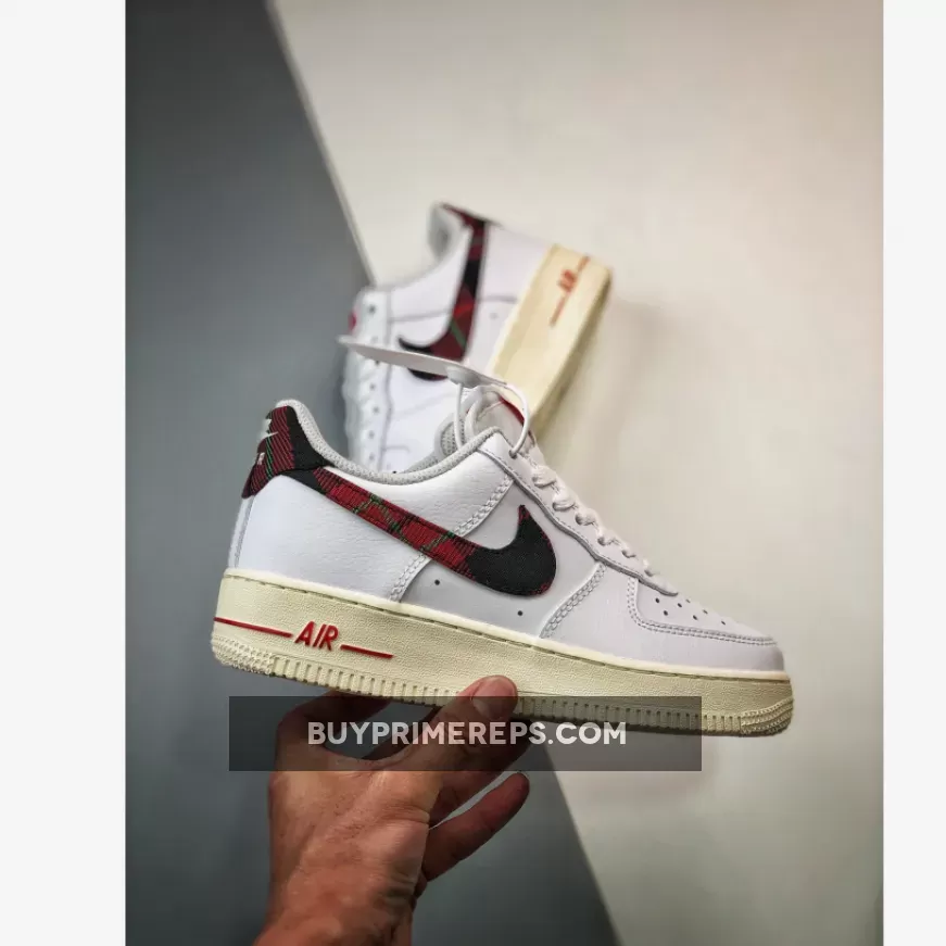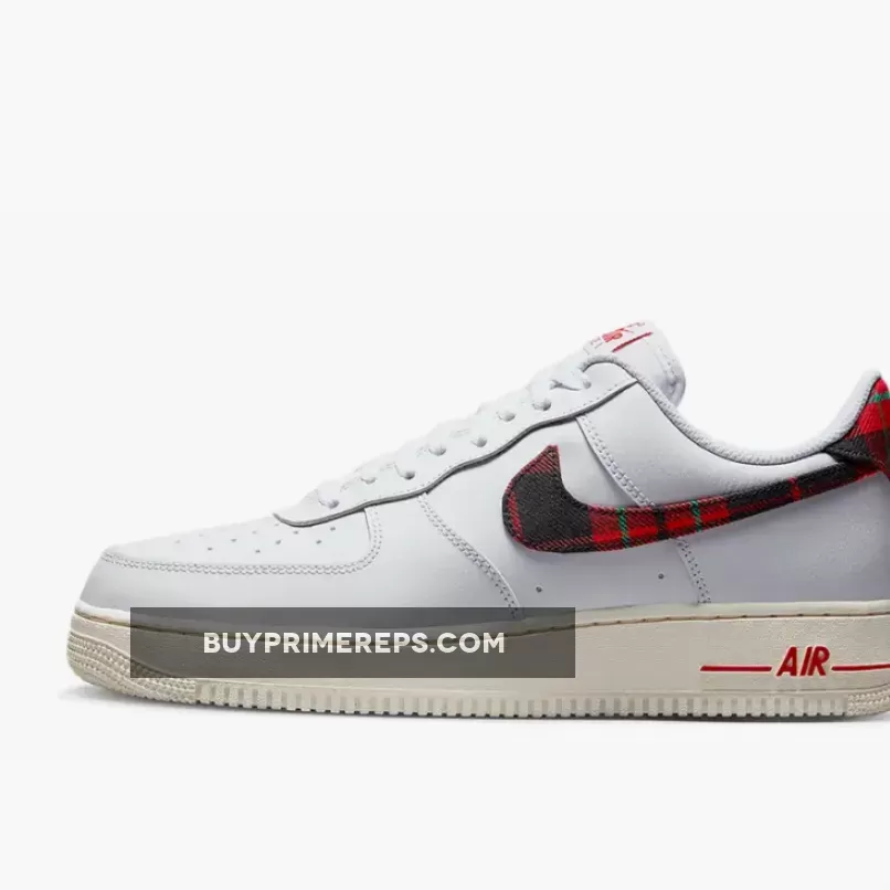 The plaid print showcases a vibrant mix of red, black, and green, adding a pop of color and personality to the shoe’s otherwise crisp white aesthetic. This unique detailing gives the Air Force 1 a dressy yet casual vibe, making it the perfect sneaker for any occasion.