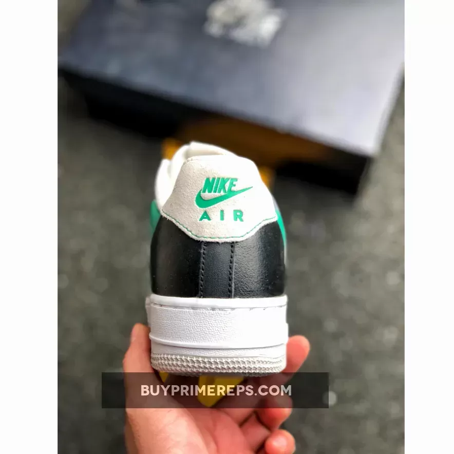 The color palette of the Nike Air Force 1 White Green Black leans towards the NikeCourt side of things, combining a soft white base with sporty green and stark black accents. The green accents can be found on the lateral and medial side panels, creating a striking contrast against the white base. Complementary green accents also make their way to the tongue and heel branding, adding a cohesive touch to the overall design.