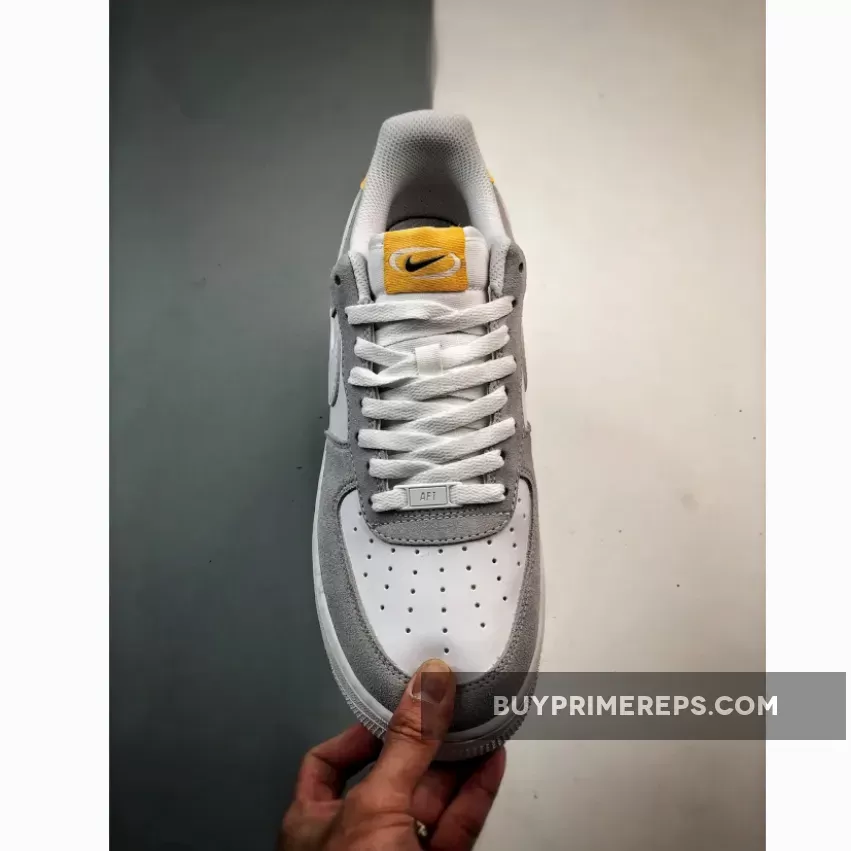The leather base of the shoe is crisp white, while the suede overlays are done in a sleek pure platinum grey. The signature Swooshes that adorn the medial and lateral side walls are a clean white, seamlessly blending in with the overall design. The tongue label and heel tab add a pop of color in melon tint, featuring black Swooshes outlined in white for a striking contrast.