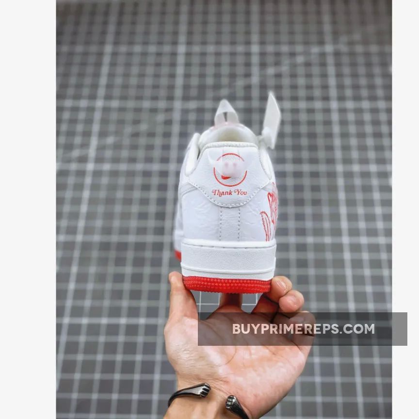 The heel of the Air Force 1 GS Rose White University Red is where the design truly comes to life. Smiley faces with Nike Swooshes replace the traditional heel tab, adding a playful and youthful element to the sneaker. Below the smiley faces, the words “Thank You” are featured, expressing gratitude and appreciation in a unique and unexpected way.