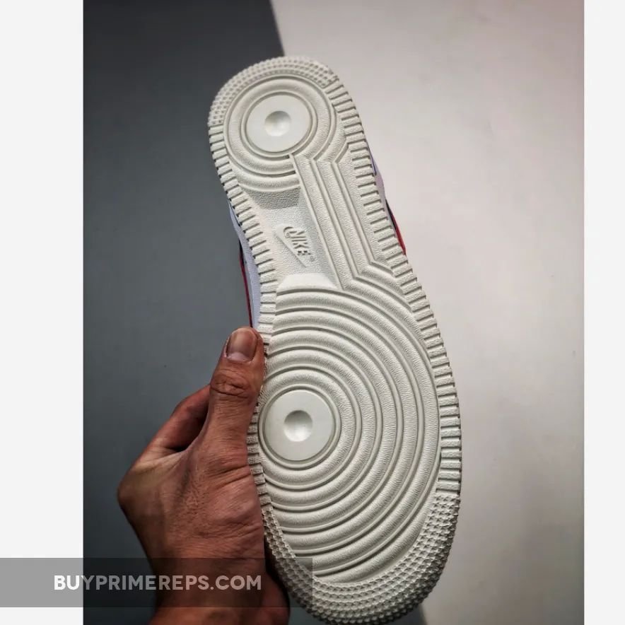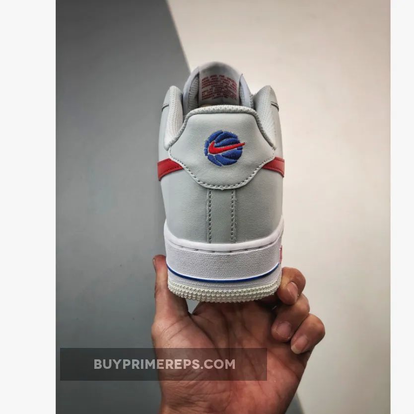 The heel tab of the Nike Air Force 1 Low ‘USA’ White Red Blue features a co-branded logo in blue and red, further emphasizing the collaboration between Nike and the NBA. On the lateral heel, you’ll find an embossed “AIR” text branding accompanied by a blue accent line, adding a touch of sporty flair.