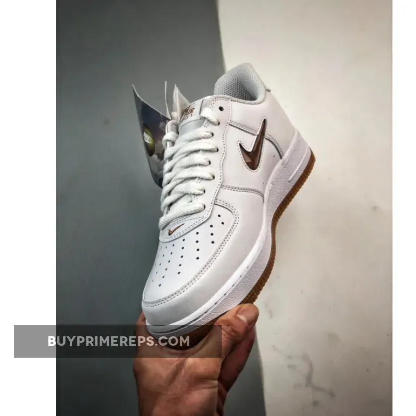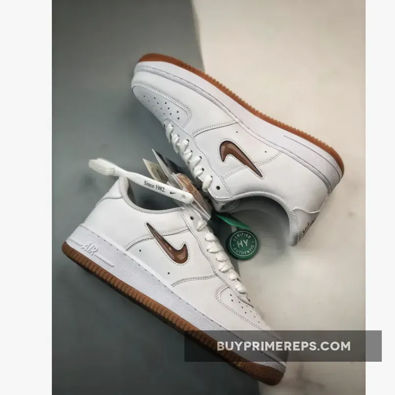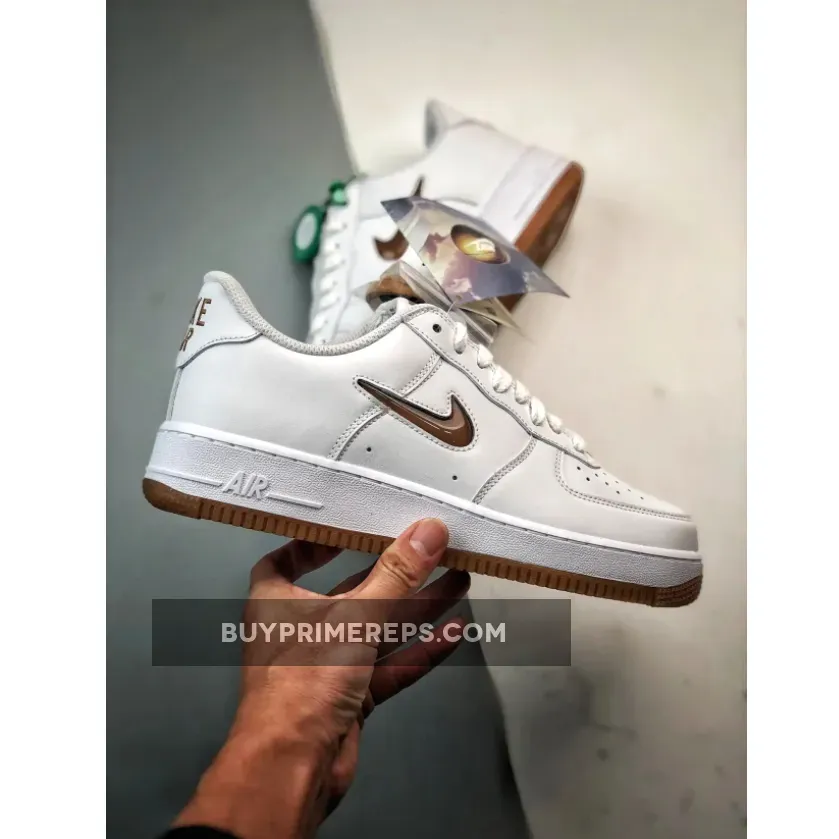 The Nike Air Force 1 Color of the Month “White Gum” features an all-white smooth leather upper that exudes a timeless elegance. From the upper to the tongues and mesh sock liners, every detail has been treated with a pristine white finish. The standout feature of this shoe is undoubtedly the jeweled Swooshes adorning the side panels. These Swooshes showcase a tan-hued gum underlay, adding a touch of sophistication and uniqueness to the design. The tan color is also repeated on the mini Swooshes at the toe area, the tongue branding, and the embroidered Nike text on the heel tabs.