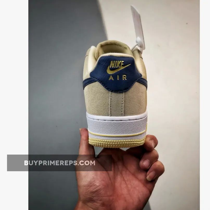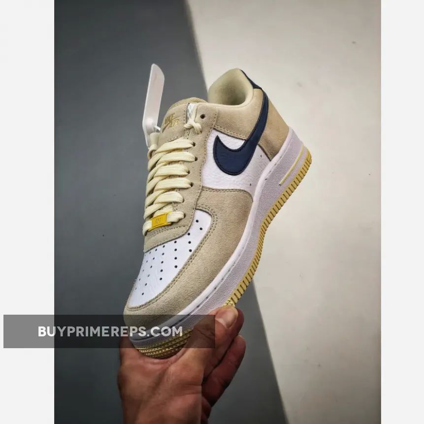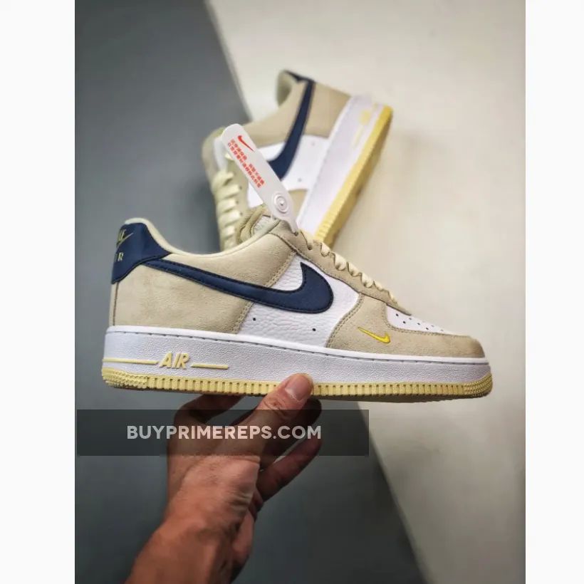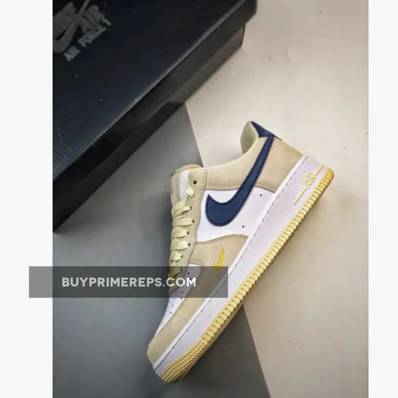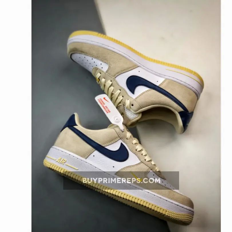 To complete the look, this Air Force 1 Low is finished off with a cream white outsole that adds a clean and classic touch to the overall design. The combination of the neutral tan and navy blue tones, along with the vibrant yellow accents, make this shoe a versatile option that can be easily paired with any outfit.