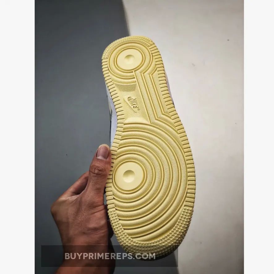 One of the standout features of this Air Force 1 is the use of yellow accents throughout the shoe. The embroidered Swoosh near the forefoot, lace dubrae, and debossed Nike labels on the tongue and heel are all done in a vibrant yellow color, making them pop against the neutral tones of the upper. The tongue is made of jersey mesh, providing added breathability for those hot summer days.