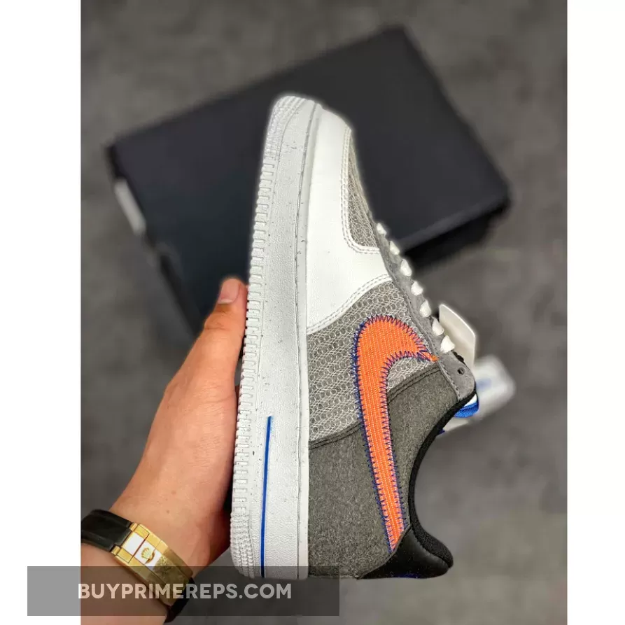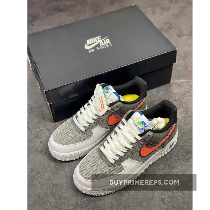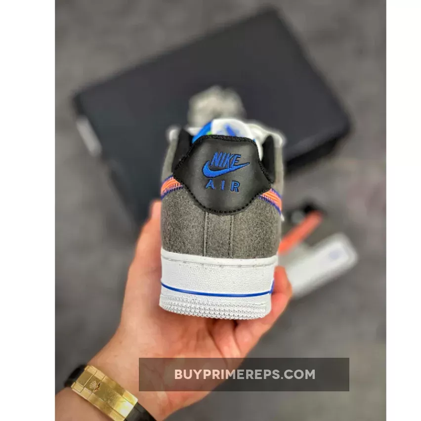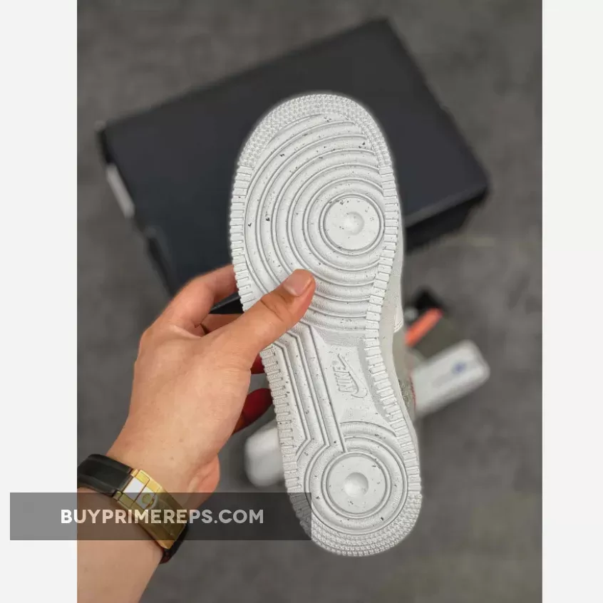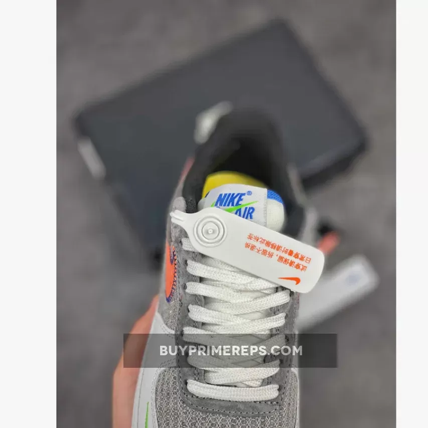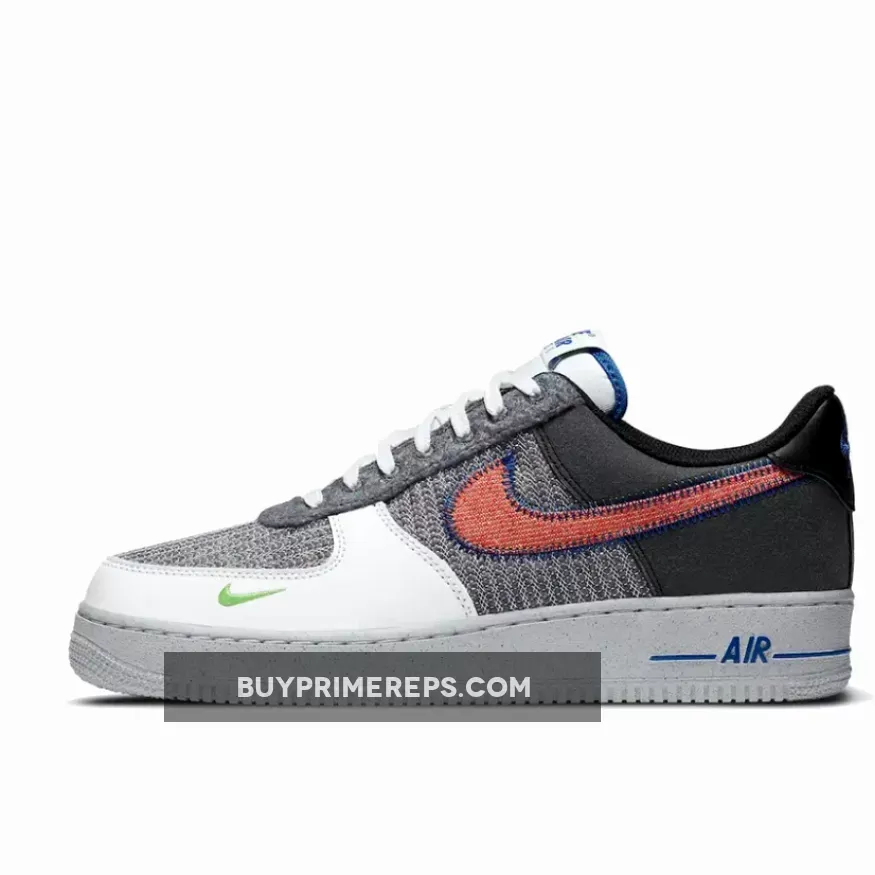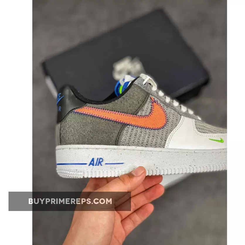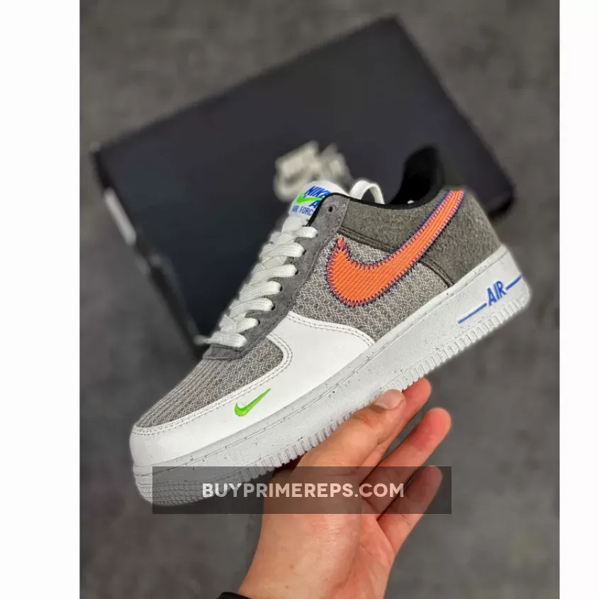 The color palette of this Air Force 1 is dominated by shades of grey, creating a sleek and understated aesthetic. However, it’s the pops of electric green that truly make this sneaker stand out. The Nike swoosh, a symbol of the brand’s excellence, is showcased on the lateral side in a vibrant crimson orange hue. The swoosh is securely sewn onto the upper with contrasting royal blue stitches, adding a touch of visual interest.
