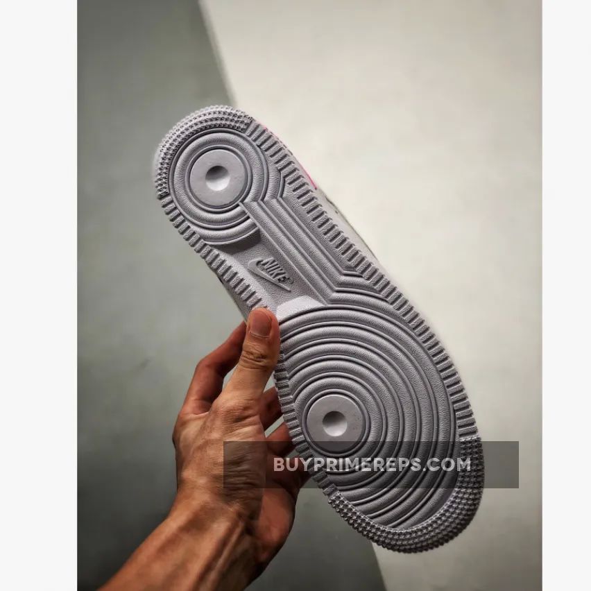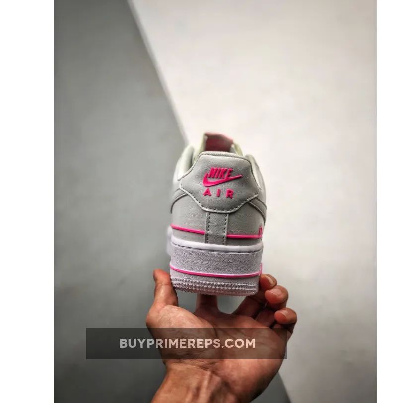 The midsole of the Nike Air Force 1 Double Air LV8 3 is cushioned for optimal comfort and support. It is presented in a clean white color, creating a striking contrast against the light grey upper. The signature ‘AIR’ branding is prominently displayed in dark pink across the lateral side of the heel, further emphasizing the shoe’s unique design. The same branding is mirrored on the heel of the upper, creating a cohesive and balanced aesthetic.