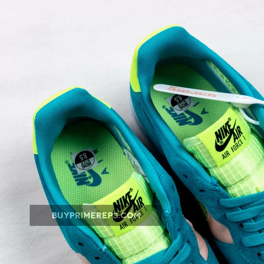 The shoe features a distinctive color palette, with a combination of aqua, cream, and volt green. The aqua color is prominently displayed on the upper, giving the shoe a fresh and vibrant look. The cream-colored suede accents provide a nice contrast and add a touch of elegance to the overall design. The volt green detailing adds a pop of color and completes the unique aesthetic of the shoe.