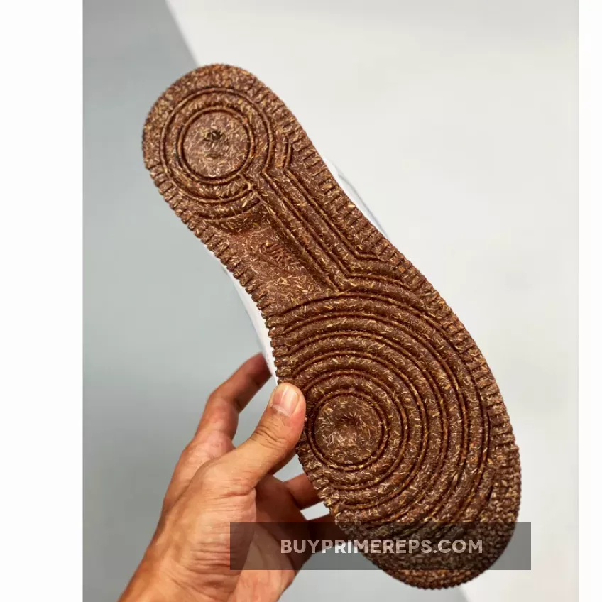 To further enhance the design, dark cork textiles are used on the lace dubraes and rear region of the shoe. This adds a touch of texture and contrast to the clean white upper. Additionally, a fig tree is embroidered on the tongue and lateral heel, adding another layer of detail and tying in with the overall theme of the shoe.