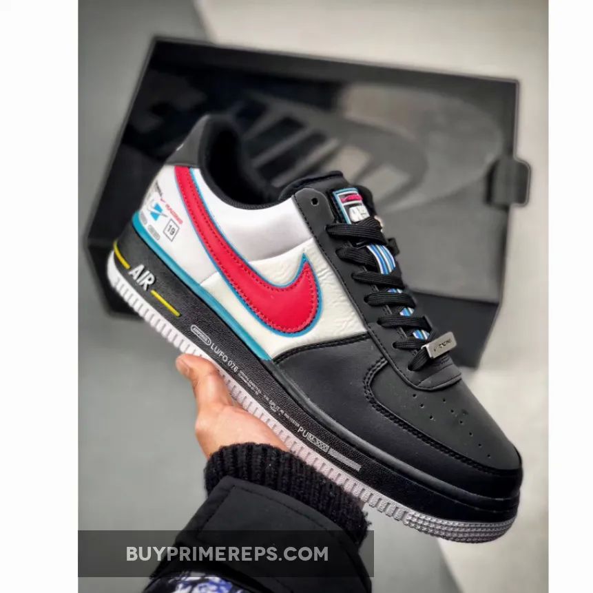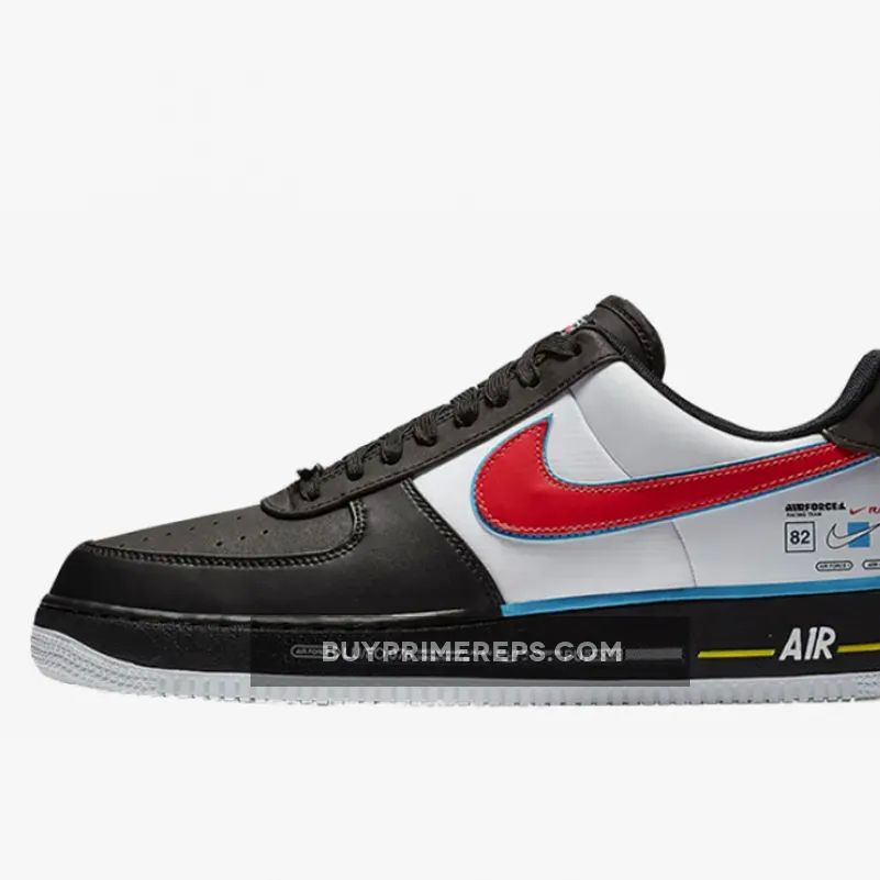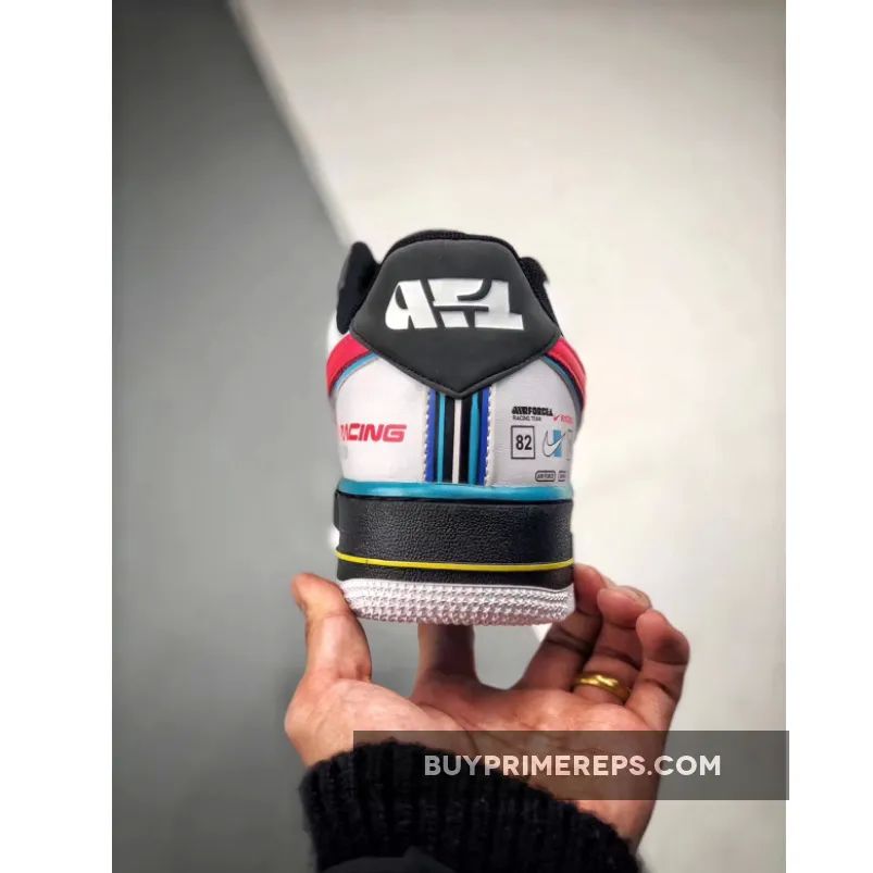 The Nike Air Force 1 Racing features a striking red, white, and blue color palette inspired by the official logo of the Charlotte Motor Speedway. A bold red Swoosh logo adorns the lateral and medial sides of the shoe, creating a fast and energetic vibe. The heel of the shoe is adorned with multiple logos, reminiscent of racing suits, further enhancing the overall racing theme. Additional branding can be found on the midsole, adding to the attention to detail and cohesive design of the shoe.