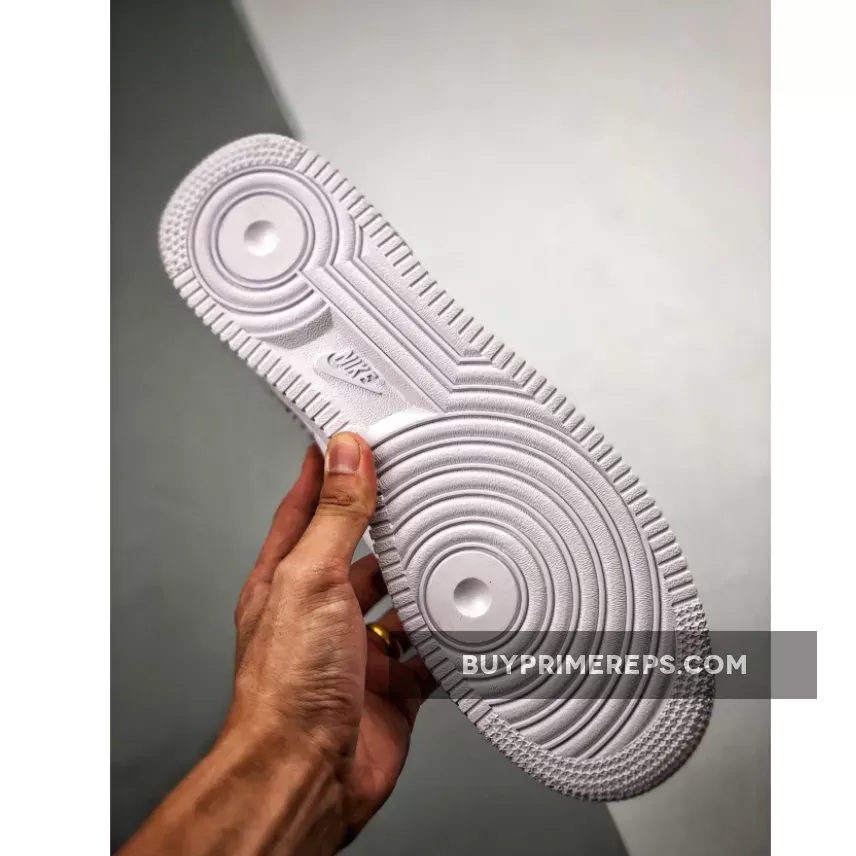 As for the construction, the shoe retains the classic Air Force 1 silhouette, with a white midsole that houses Nike’s signature Air cushioning technology for all-day comfort. The lacing system is made of light grey suede, complementing the white upper and adding a touch of contrast.