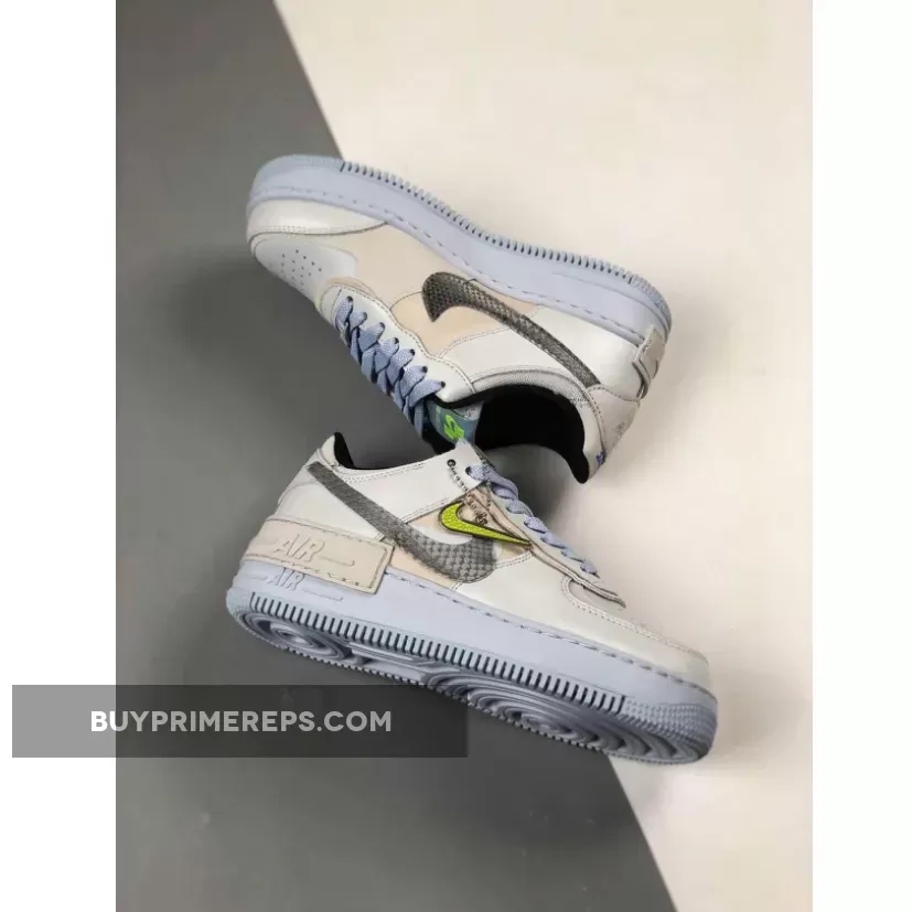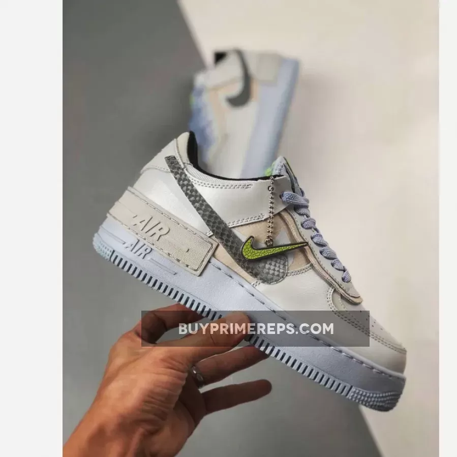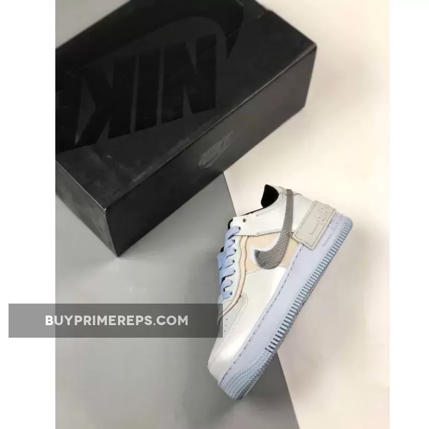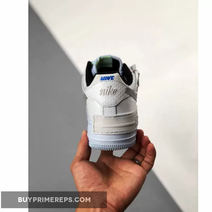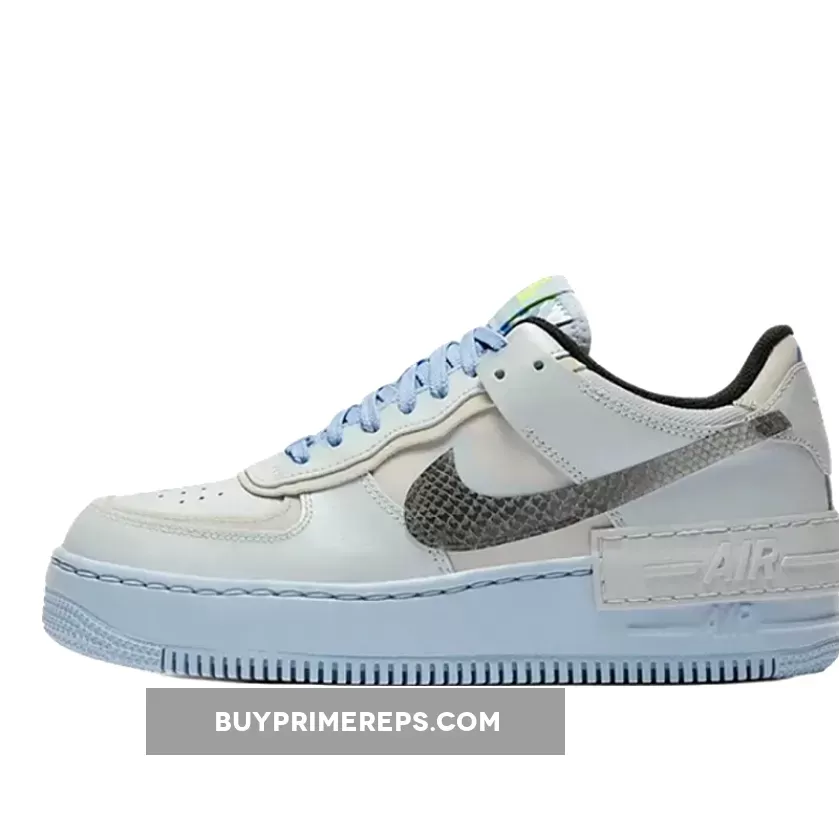 Overall, the Nike Air Force 1 Shadow Hydrogen Blue is a stylish and fashion-forward sneaker that combines classic design elements with contemporary updates. Its pastel blue color palette, snakeskin print overlays, and doubled-up detailing make it a standout choice for those looking to make a statement with their footwear. Whether you’re a fan of the Air Force 1 silhouette or simply appreciate unique and eye-catching design, this shoe is sure to impress.