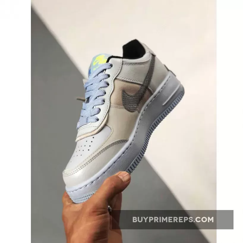 The color palette of the Air Force 1 Shadow Hydrogen Blue is cool and refreshing. The upper combines two different shades of grey, which complement the pastel blue perfectly. The midsole is a muted baby blue, adding a subtle pop of color to the overall look. The laces of the shoe are in a “UNC” hue, a light shade of blue that matches the midsole, while highlighter yellow accents on the tongue and Nike Air branded footbeds provide a vibrant contrast.