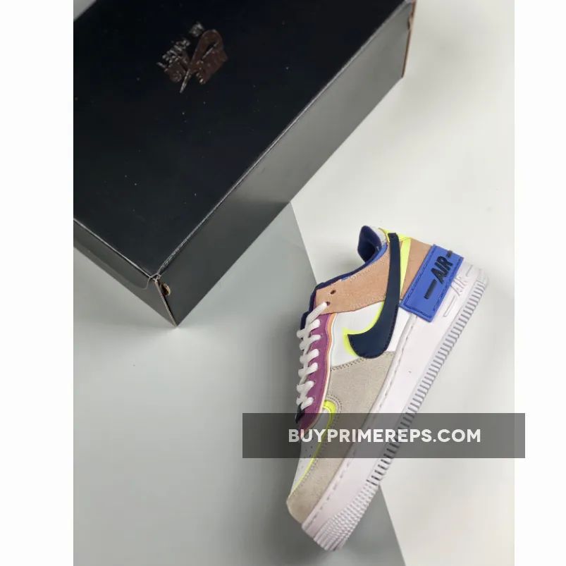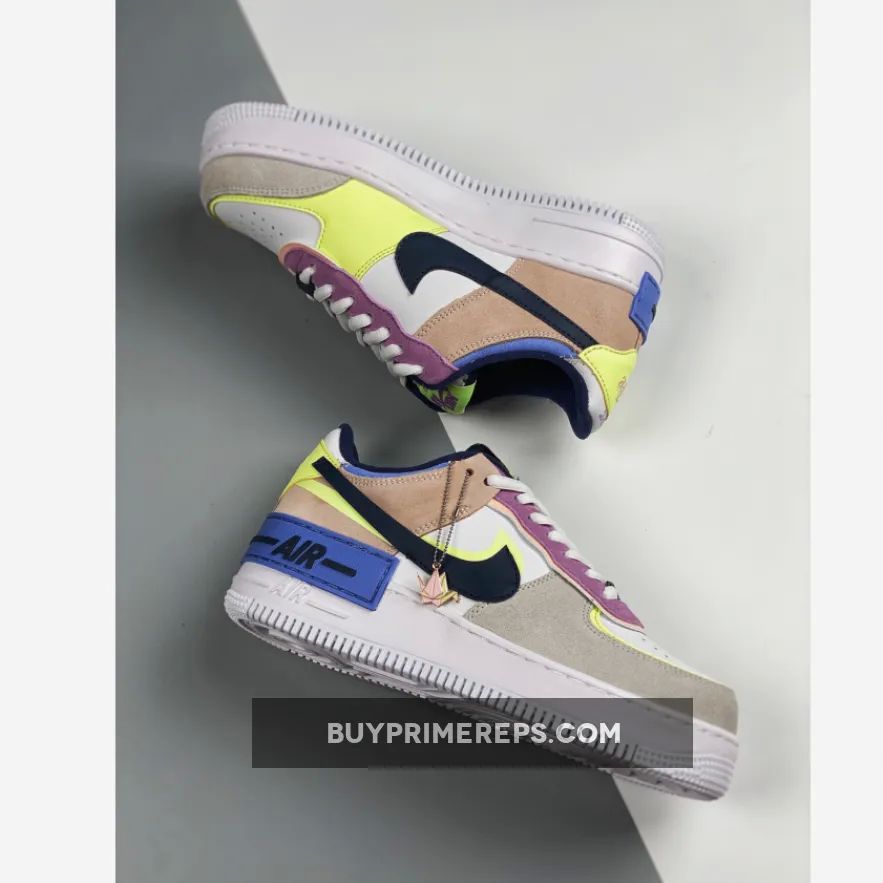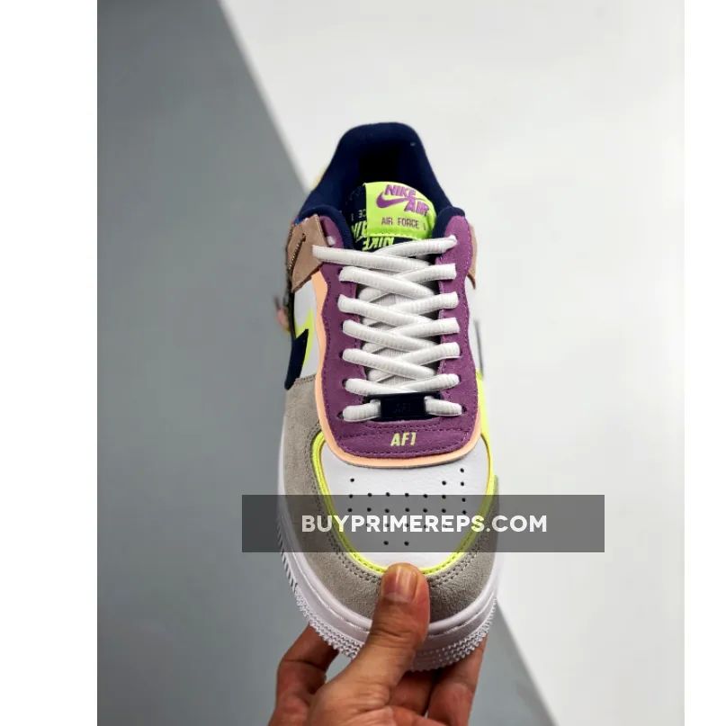 Introducing the Nike Air Force 1 Shadow in the striking colorway of Photon Dust, Royal Pulse, and Barely Volt. This latest iteration of the Air Force 1 Shadow features a combination of muted base colors with vibrant accents, creating a bold and fashionable look.