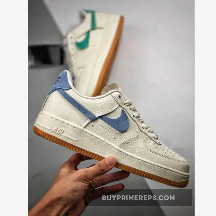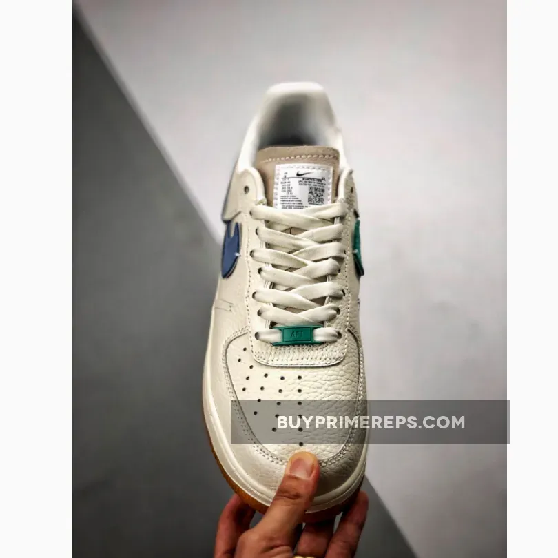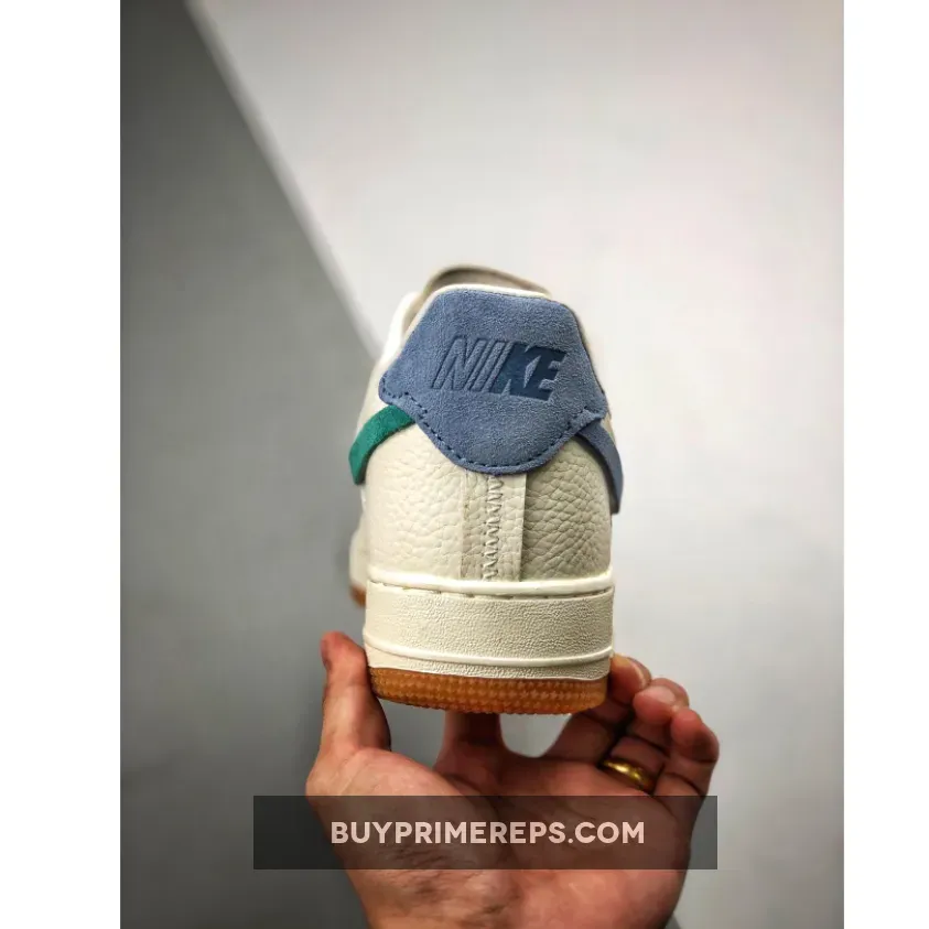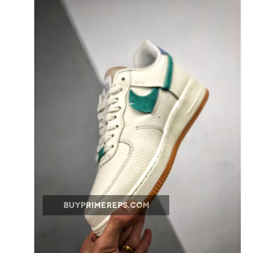 The color blocking on this Air Force 1 is also noteworthy. The upper is primarily done in a clean Sail color, providing a neutral base for the bold accents. The Swoosh and heel feature a combination of Green and Light Blue, creating a striking contrast against the Sail backdrop. This color scheme adds a pop of color to the sneaker and gives it a fresh, vibrant feel.