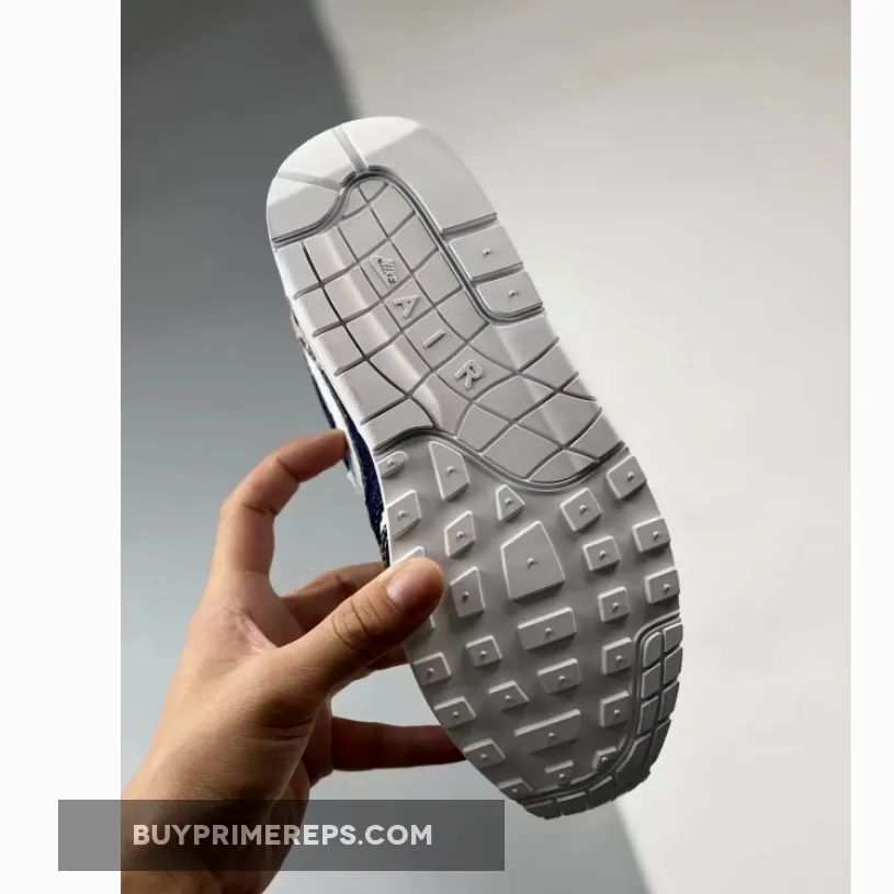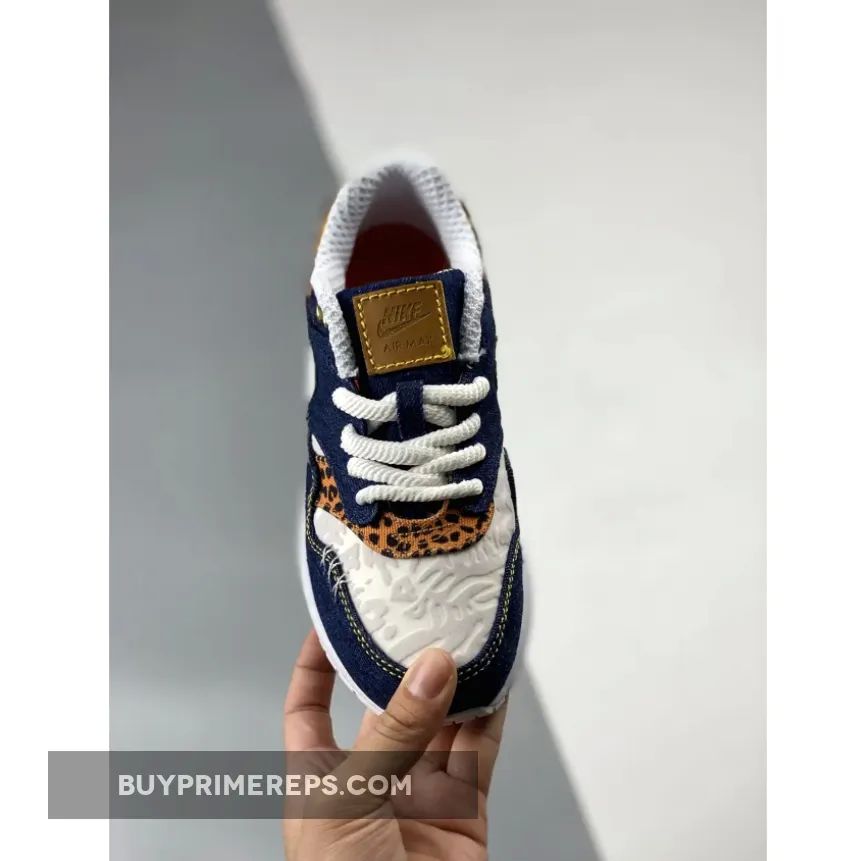 The Nike Air Max 1 Premium Denim Leopard FJ4452-432 is a sneaker that combines animal designs with a DIY aesthetic, resulting in a unique and eye-catching shoe. The upper is made of a textured white material, with blue denim construction on the mudguard and quarter panels. This combination of materials gives the shoe a distinct and stylish look.