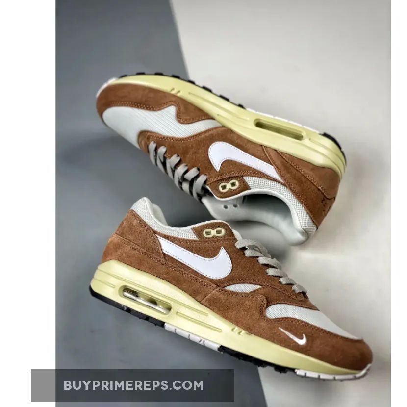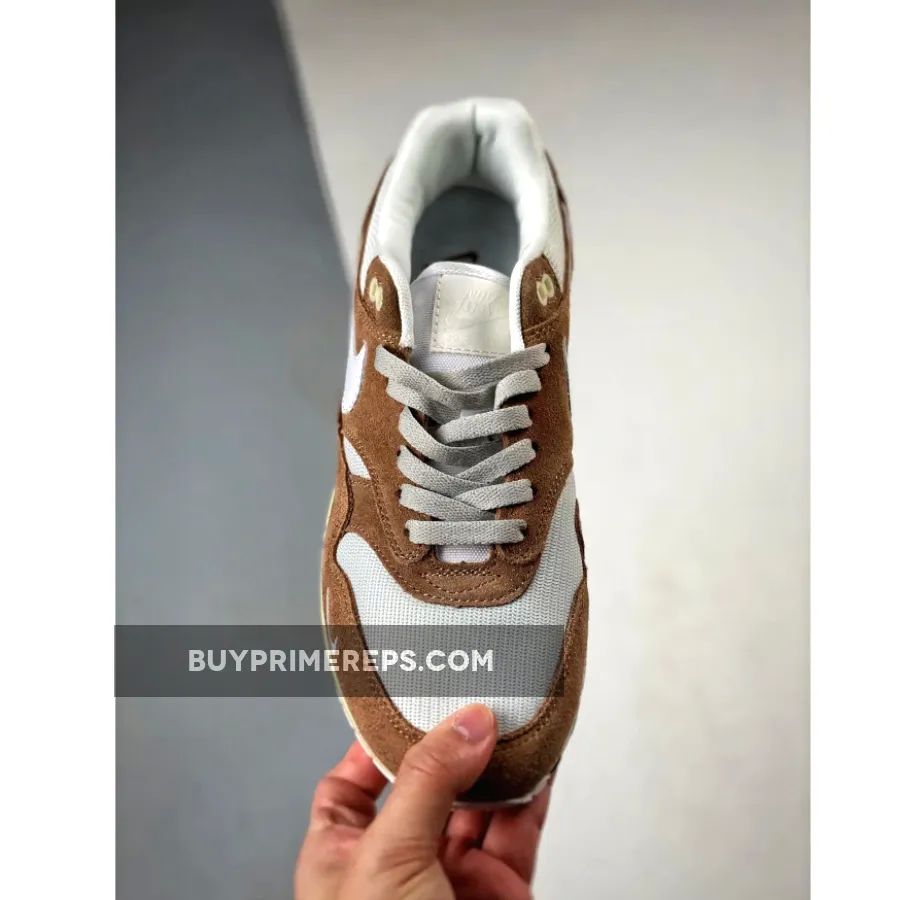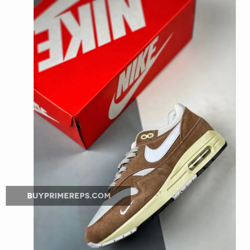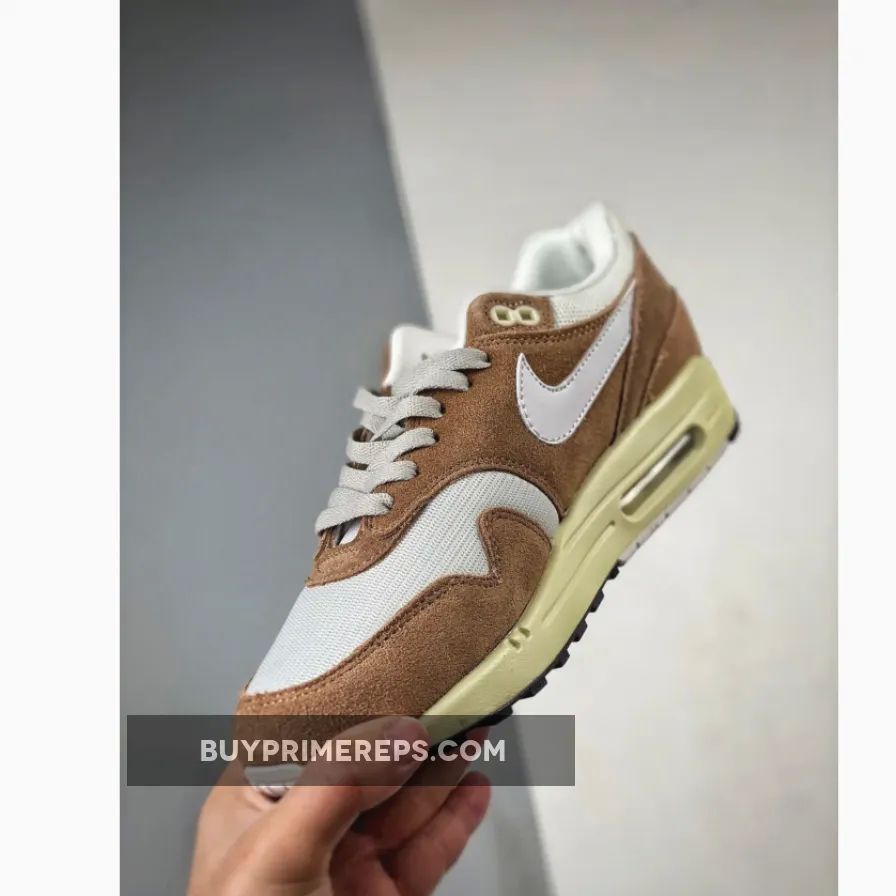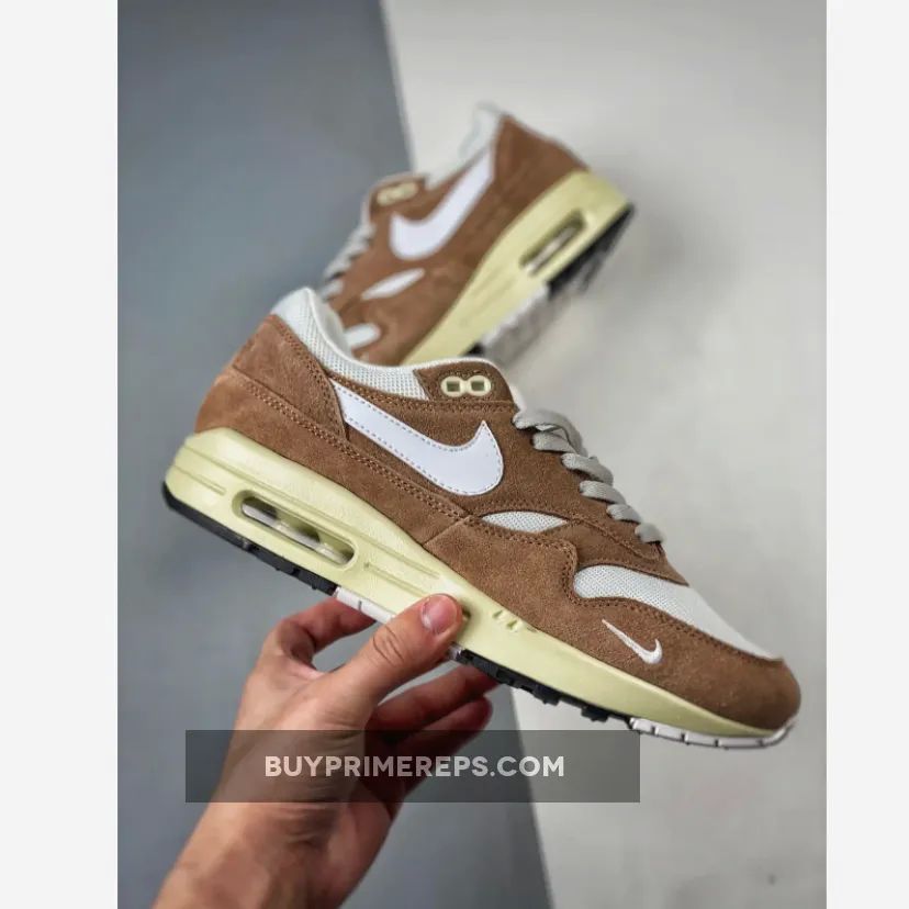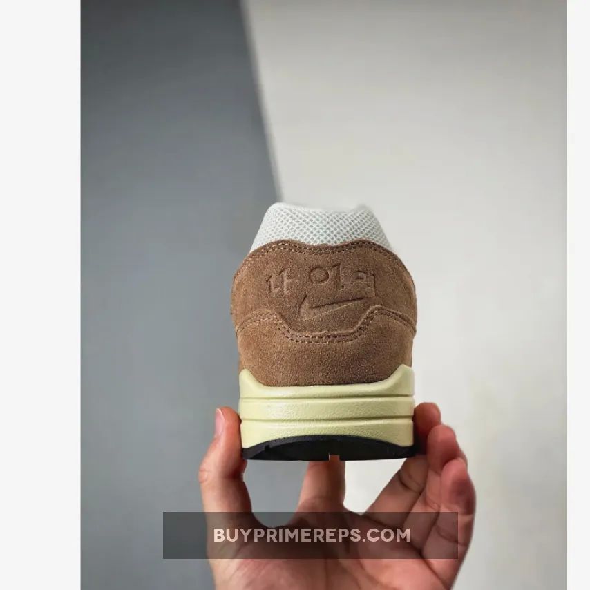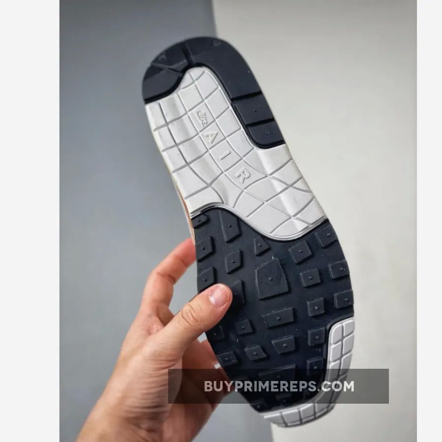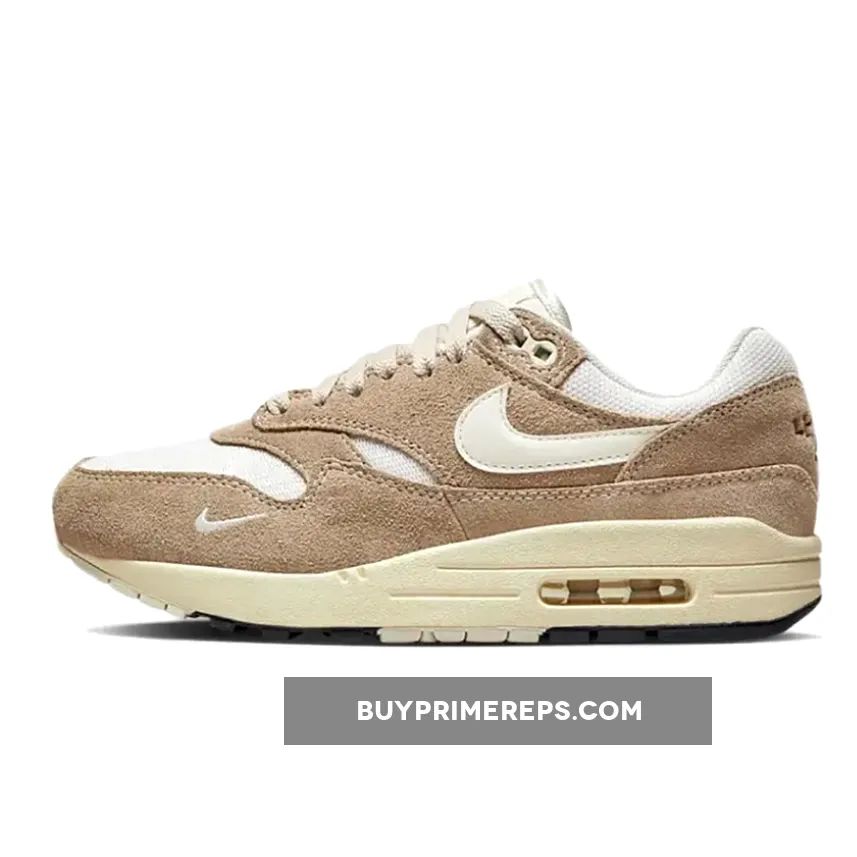 The upper of the Air Max 1 is constructed with a white mesh material, providing breathability and comfort. It is complemented by light brown suede overlays, which add a touch of elegance to the design. These overlays can be seen on the mudguard, midfoot, and heel panels, giving the shoe a structured and refined appearance.