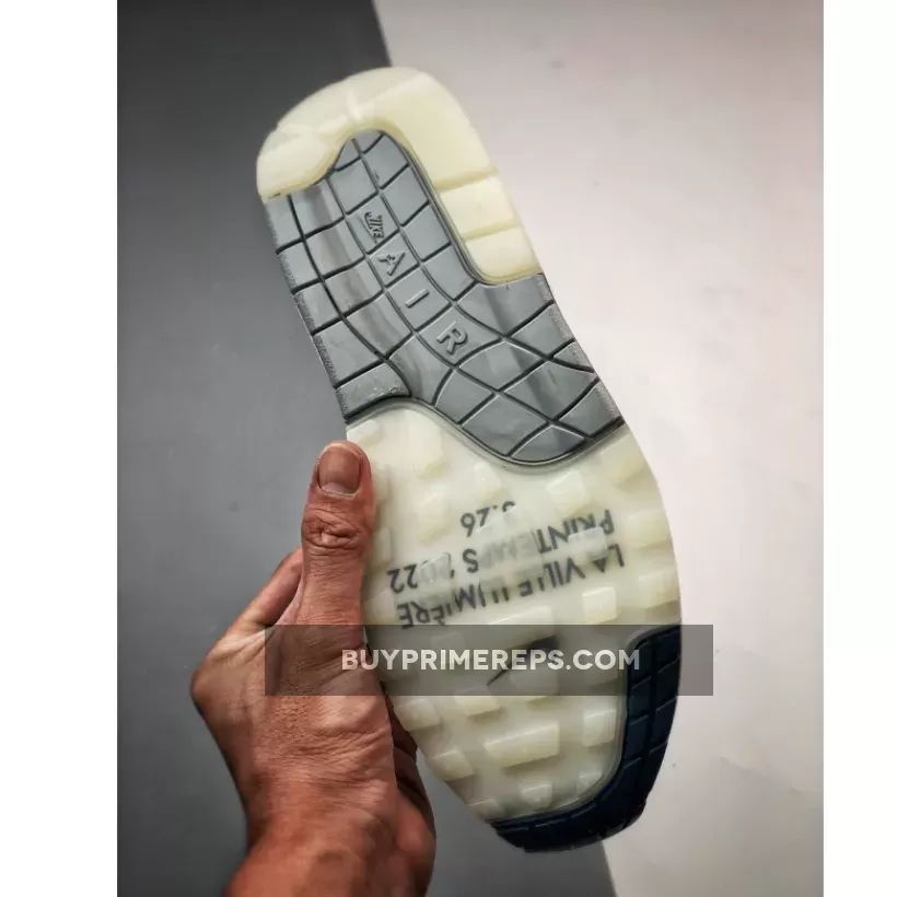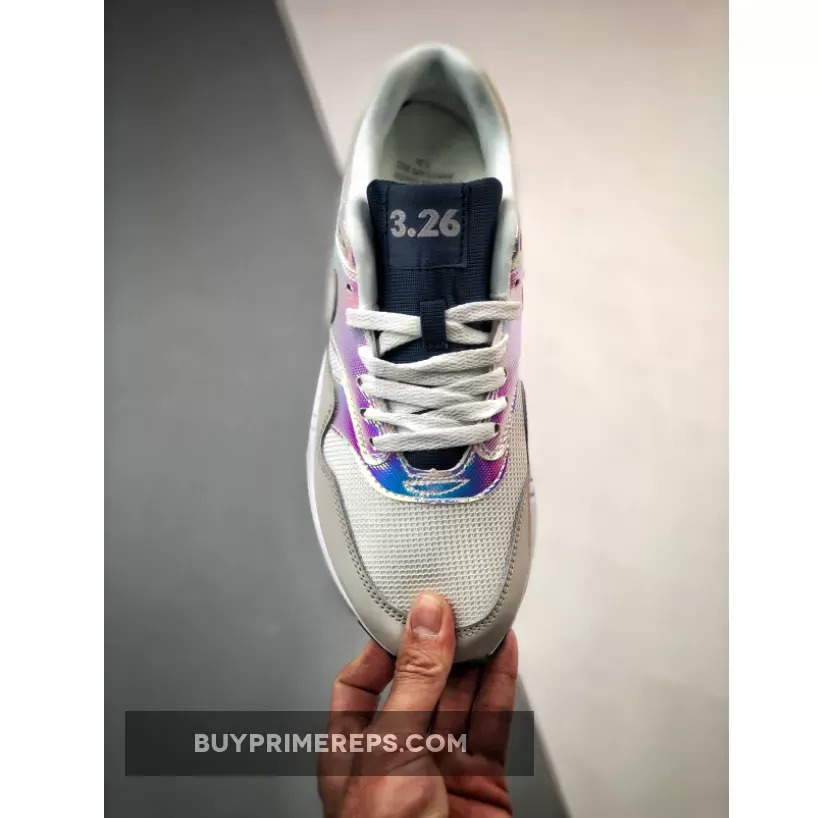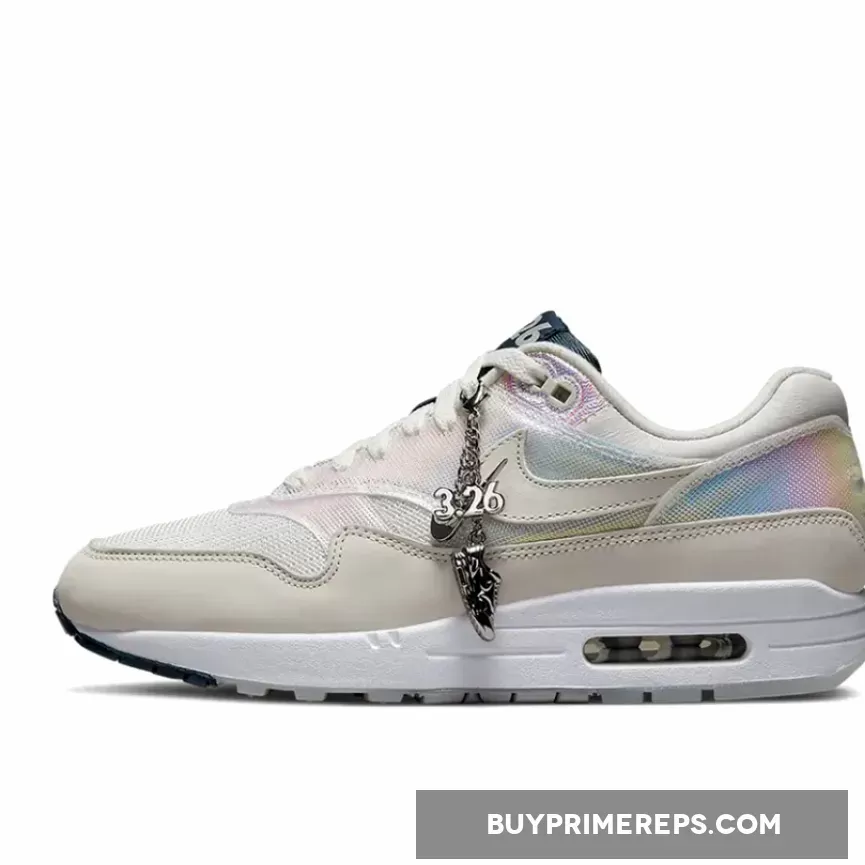 The midsole of the Air Max 1 La Ville Lumiere is white, with a traditional Air Max unit for cushioning and comfort. The outsole is made of grey rubber, providing durability and traction. To add a special touch, the shoe comes with a dangling metallic accessory featuring charms in the shape of “3.26” text, a Swoosh, and a sneaker. This adds a unique and personalized touch to the overall design.
