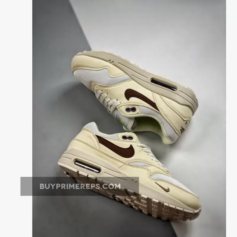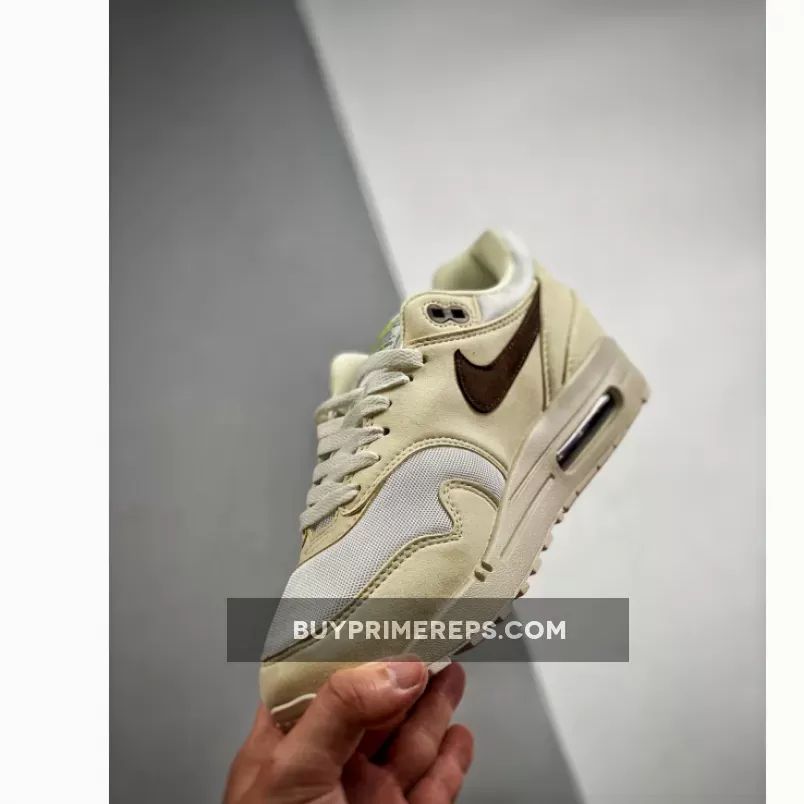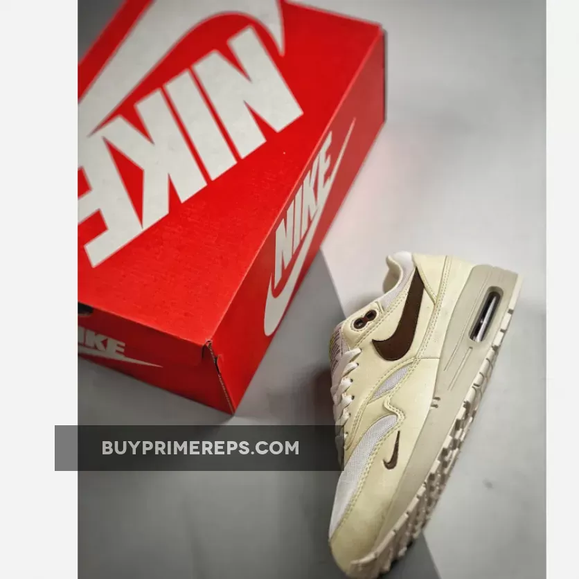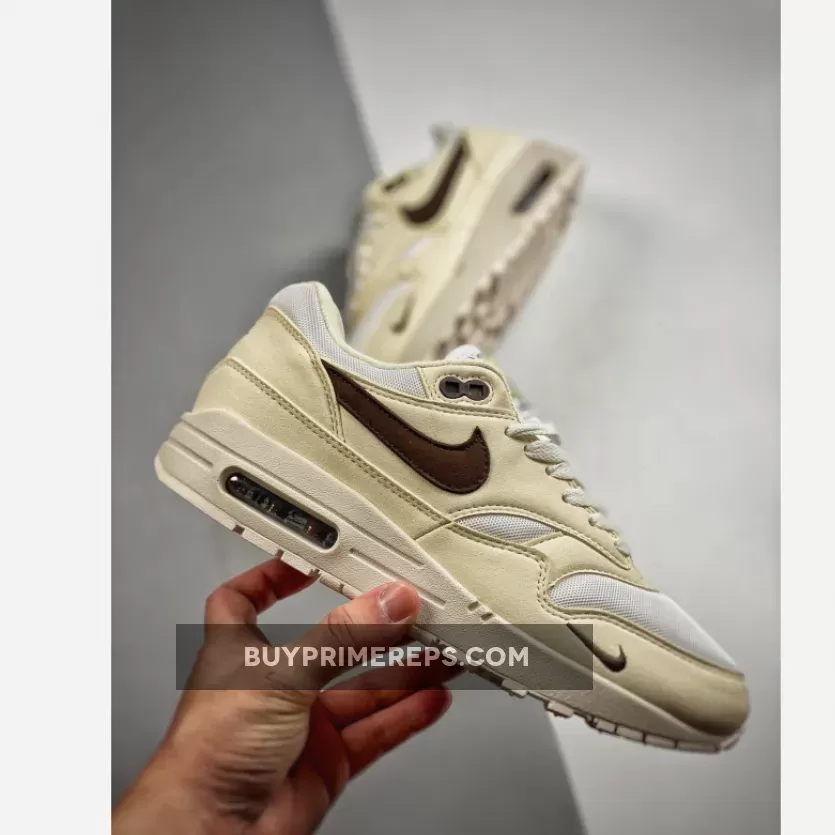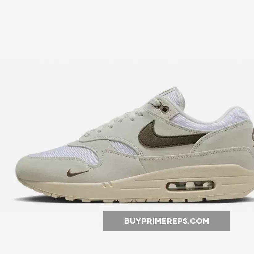One of the defining characteristics of the Air Max 1 Ironstone is the incorporation of the iconic Swoosh logo. The Swoosh is prominently displayed on the sides of the shoe in a rich brown hue, adding a touch of contrast and visual interest to the design. Additionally, a smaller Swoosh logo adorns the lateral toe, further emphasizing the brand’s heritage and legacy.
