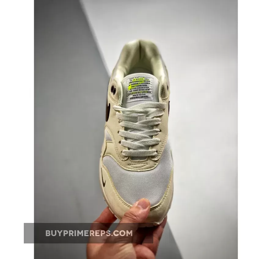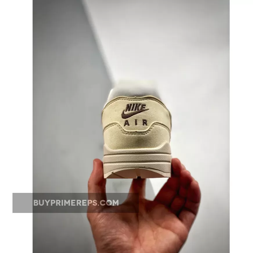 The design of the Air Max 1 Ironstone features a blend of classic and modern elements. The shoe boasts a clean and crisp white mesh base, complemented by supple suede overlays in an elegant off-white shade. The use of premium materials and attention to detail elevate the overall aesthetic of the sneaker, making it a standout choice for both casual wear and sneaker aficionados.