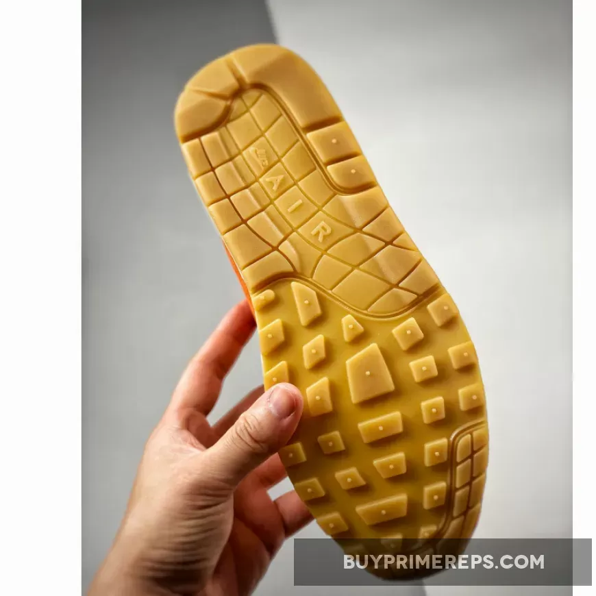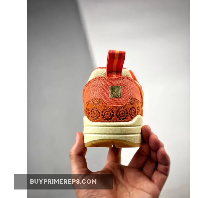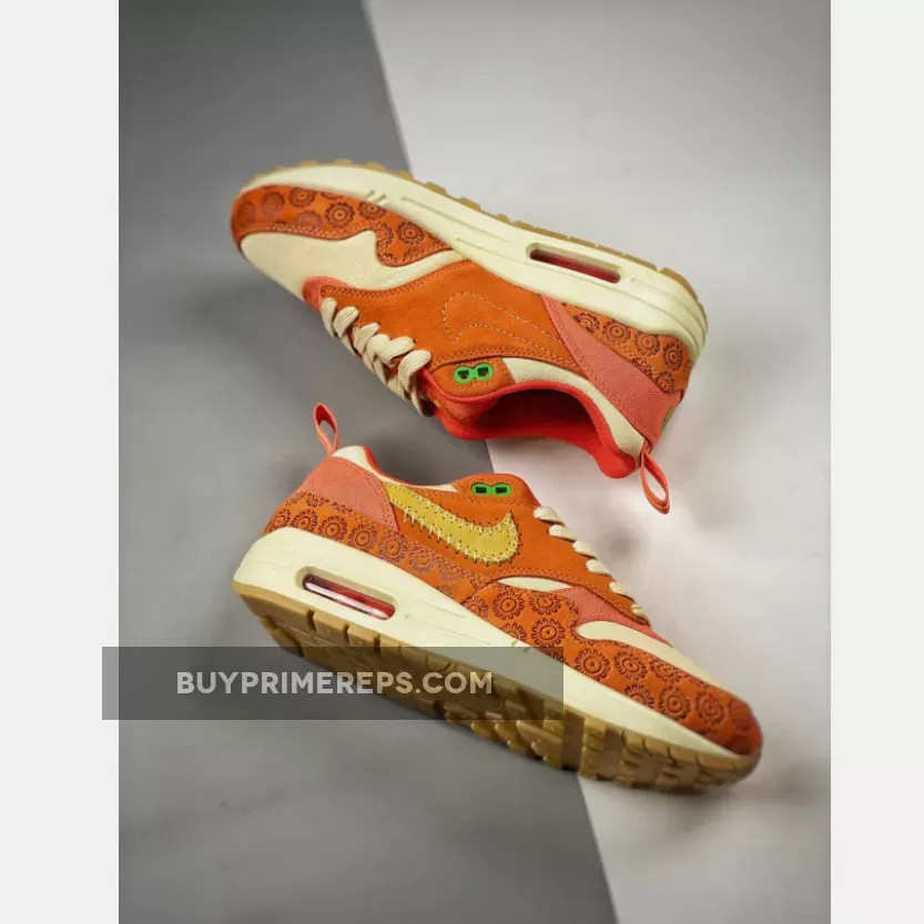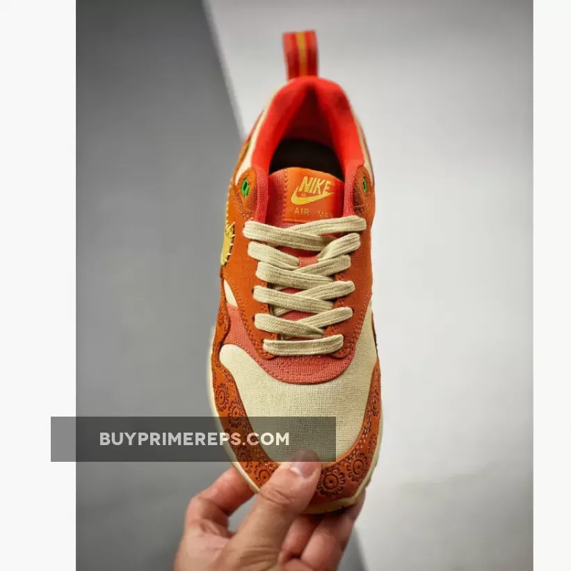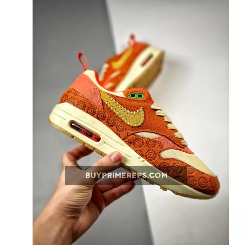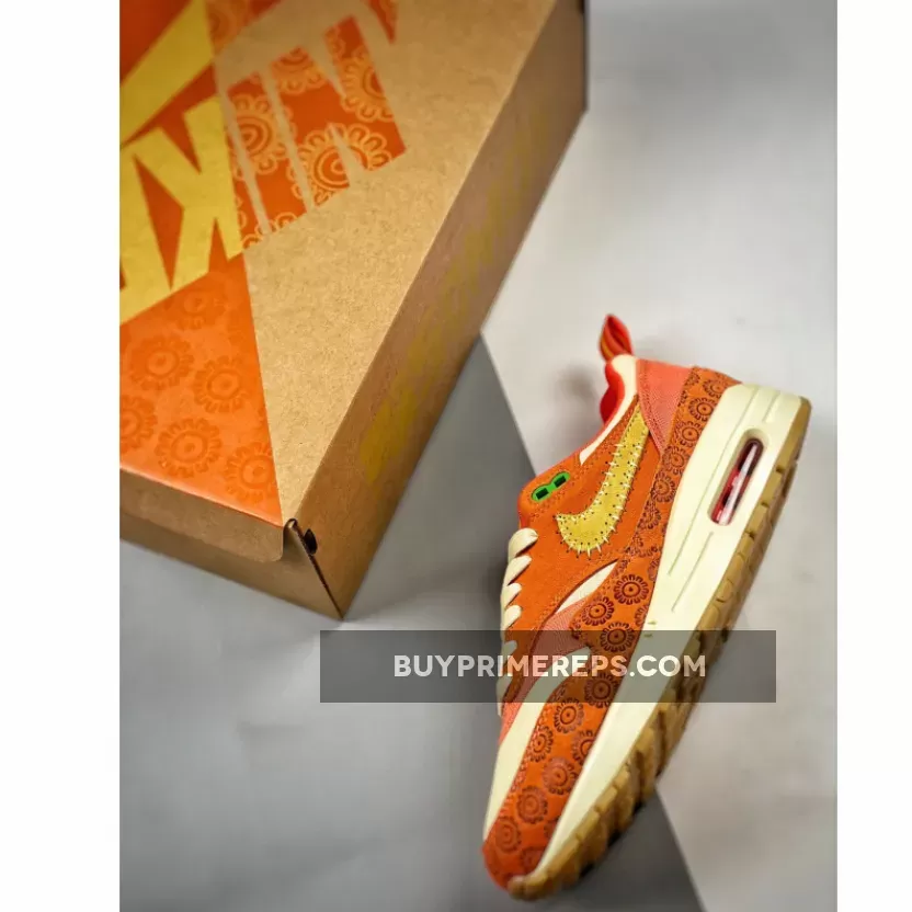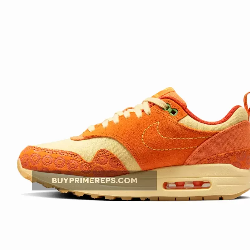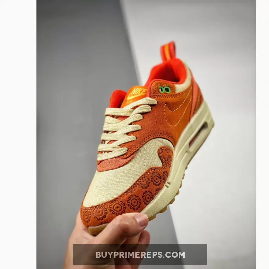 The Nike Air Max 1 Somos Familia showcases a premium construction, using a combination of suede and canvas materials instead of the usual leather. The sneaker is adorned with a two-toned design, with a pale yellow base and bold orange overlays. What sets this iteration apart is the addition of decorative patterns around the toe and heel areas, adding a touch of flair to the overall design. The Nike Swooshes on the sides are replaced with an outline, offering a distinct look.