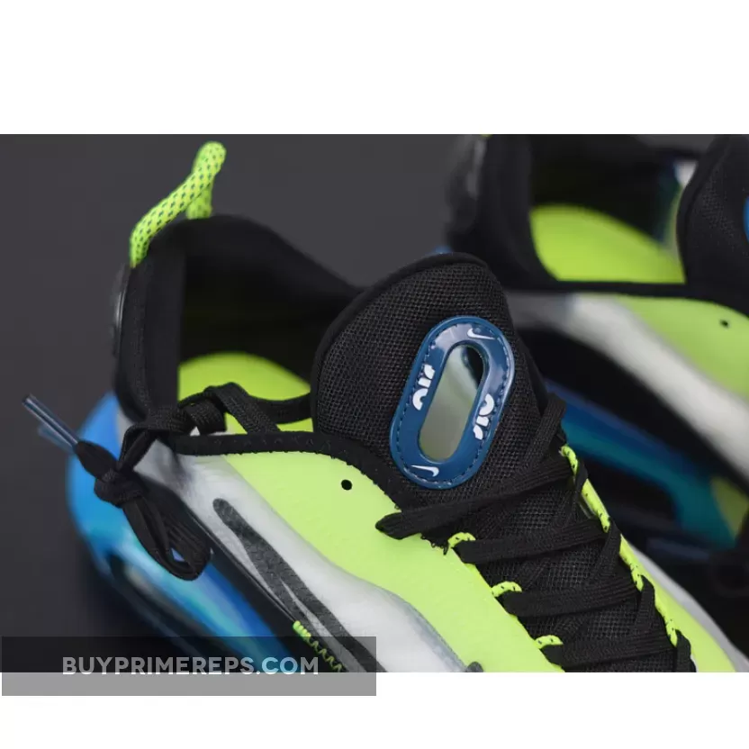To inject some energy and vibrancy into the shoe, Nike has incorporated volt and blue accents throughout. These pops of color can be seen on the Swoosh logos, the Air Max branding on the tongue, and various other details on the shoe. The volt and blue accents provide a striking contrast against the predominantly white upper, adding a dynamic and eye-catching element.