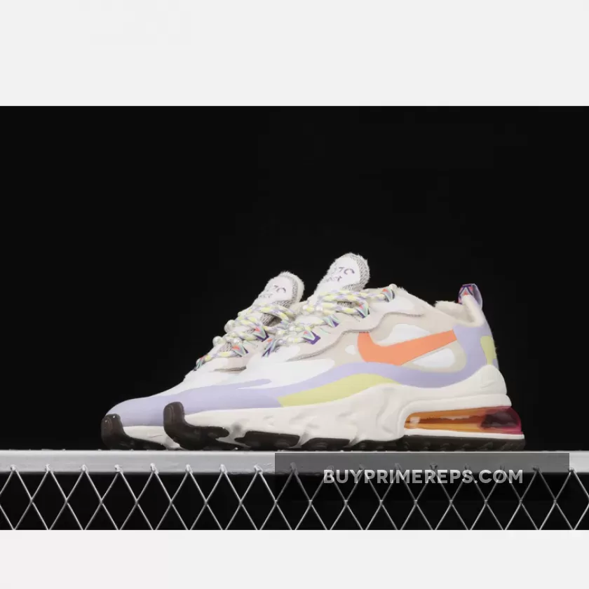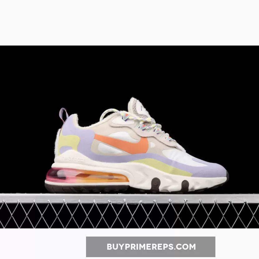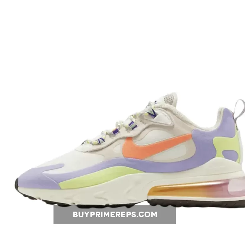 The Nike Air Max 270 React Cream Purple Orange is a stunning sneaker that combines classic design elements with vibrant, eye-catching colors. The upper of the shoe is primarily composed of a blend of white and beige, creating a clean and versatile base. However, what truly sets this shoe apart is the addition of pastel orange, purple, and yellow accents throughout the upper. These pops of color add a playful and energetic touch to the overall aesthetic.