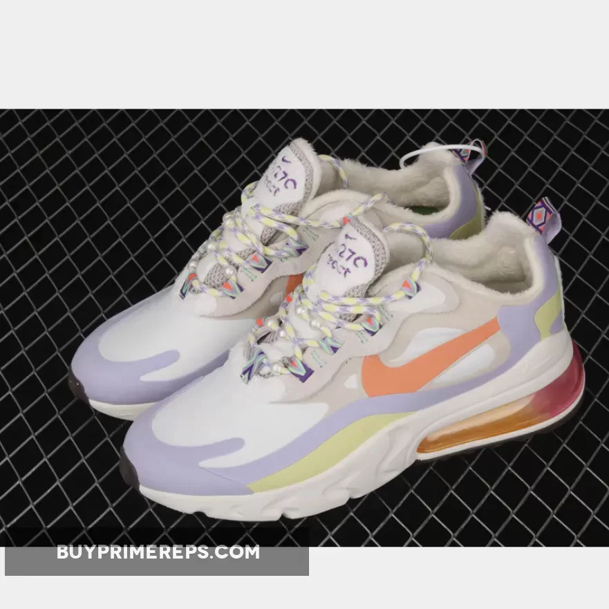 In terms of functionality, the Nike Air Max 270 React Cream Purple Orange is designed with comfort in mind. The shoe features a fleece lining, ensuring that your feet stay warm and cozy during colder months. The combination of the Air Max unit and React cushioned midsole provides excellent cushioning and support, making these shoes ideal for all-day wear.