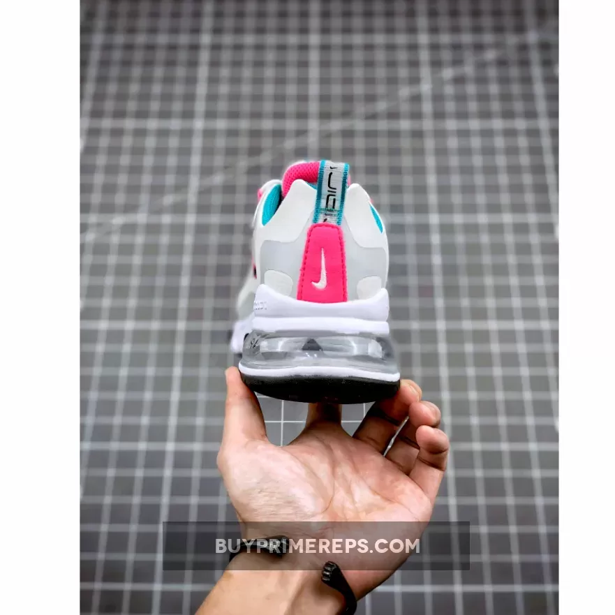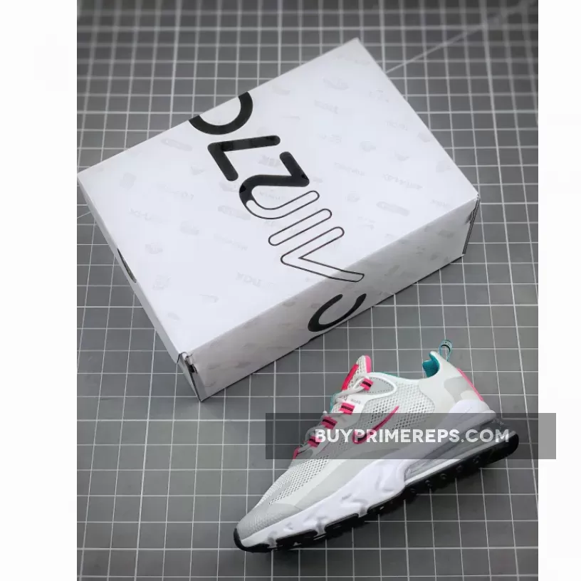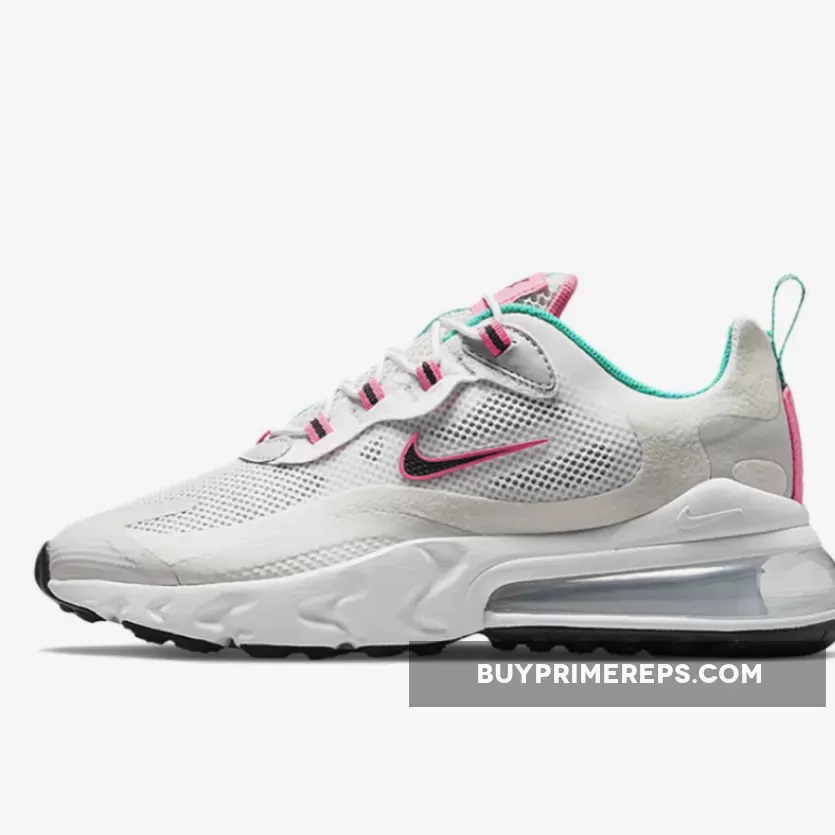 The upper of the Air Max 270 React Teal is constructed with a white perforated mesh material, allowing for breathability and comfort. Suede overlays add a touch of luxury and durability to the shoe. The teal and pink contrasting accents give the shoe a pop of color, making it stand out from the crowd. The “Max Air” logos on the tongues and insoles add a subtle branding touch.