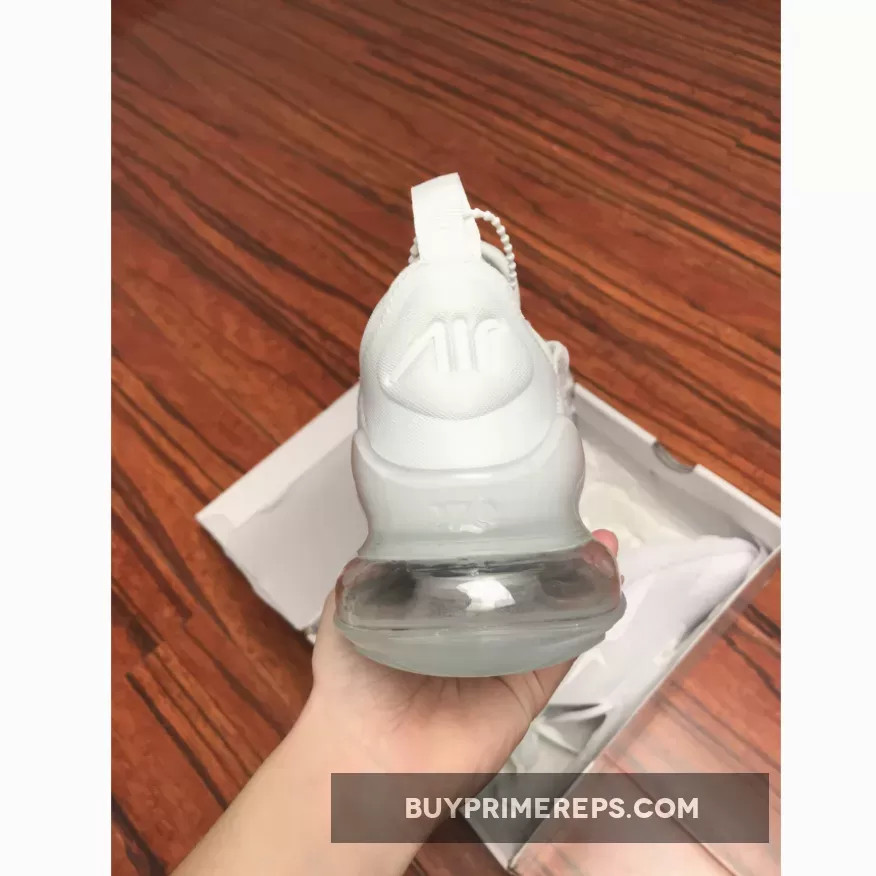 The upper of the Air Max 270 Triple White Womens is constructed with Flyknit material, offering a lightweight and breathable feel. The Swoosh branding is subtly placed along the side panels, adding a touch of branding without overwhelming the clean aesthetic. The heel portion features the “Air” and “270” branding, further showcasing the shoe’s heritage and identity.