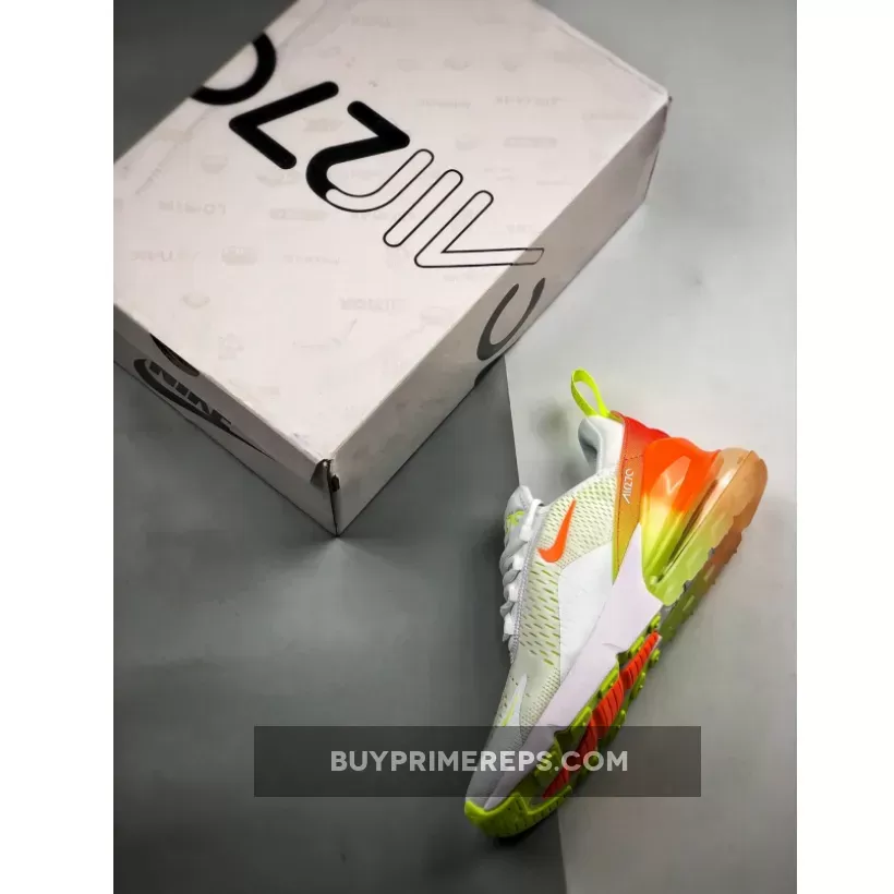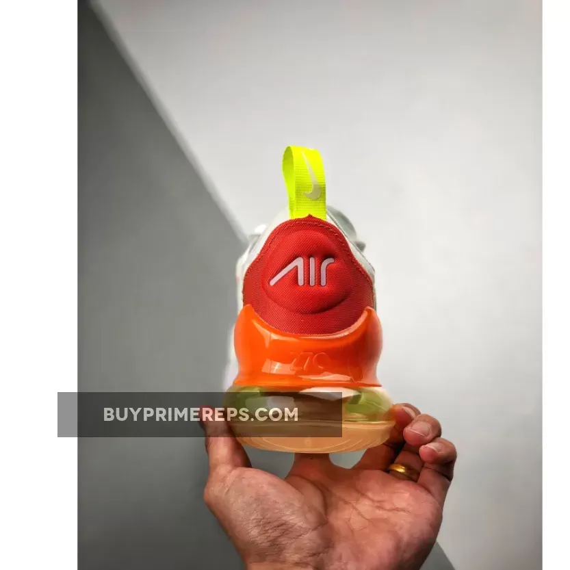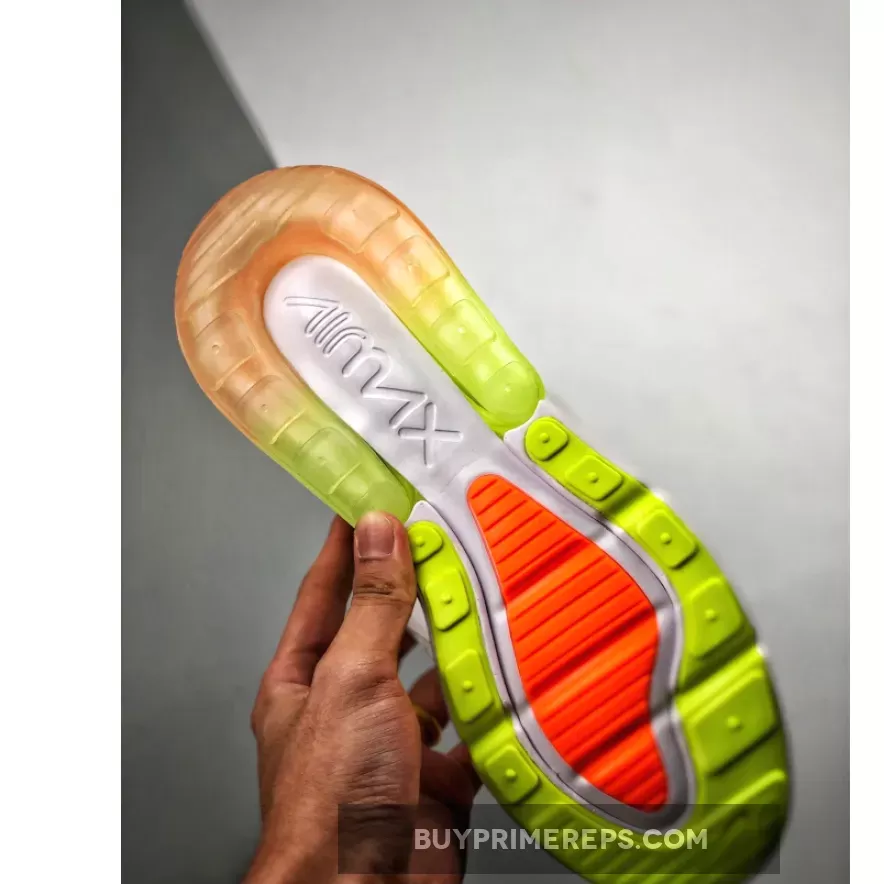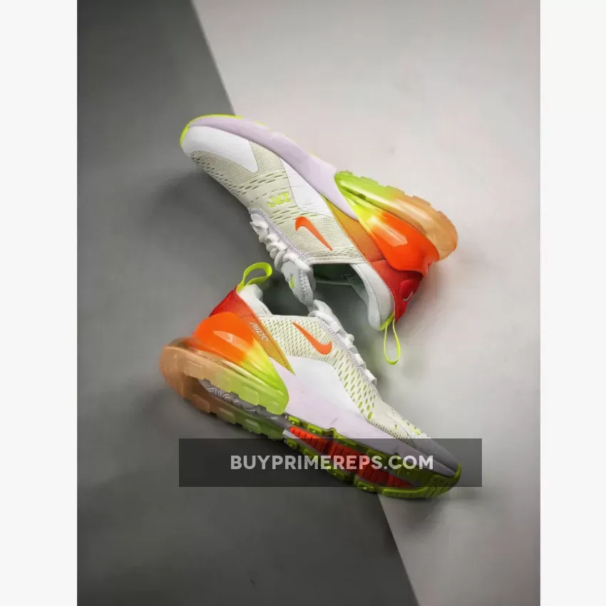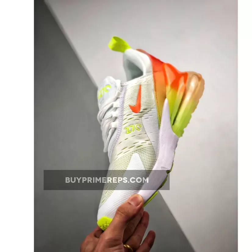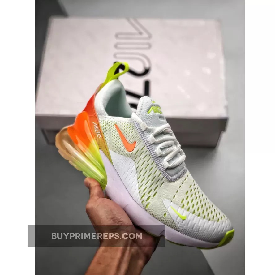 One of the standout features of this shoe is the gradient Air Max 270 heel unit. Starting with a bright Volt color at the top, the heel unit gradually fades into a vibrant orange shade. This gradient effect adds visual interest and gives the shoe a unique and dynamic appearance.