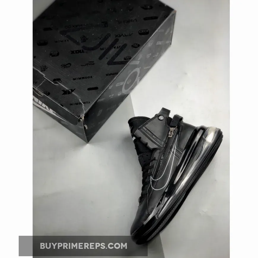 Introducing the Nike Air Max 720 Saturn Black AO2110-001, a contemporary and stylish addition to your sneaker collection. This iteration features a sleek “Triple Black” color scheme, creating a stealthy and edgy look that is perfect for any occasion. The all-black upper is made from durable nylon material, giving it a boot-like design that extends up through the ankle for added support and style.