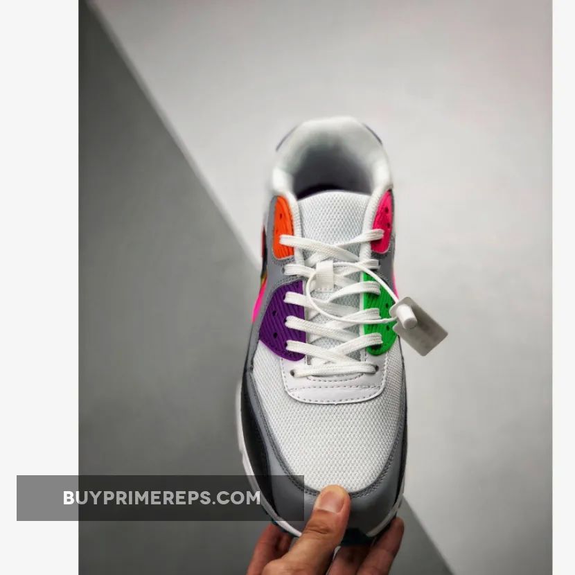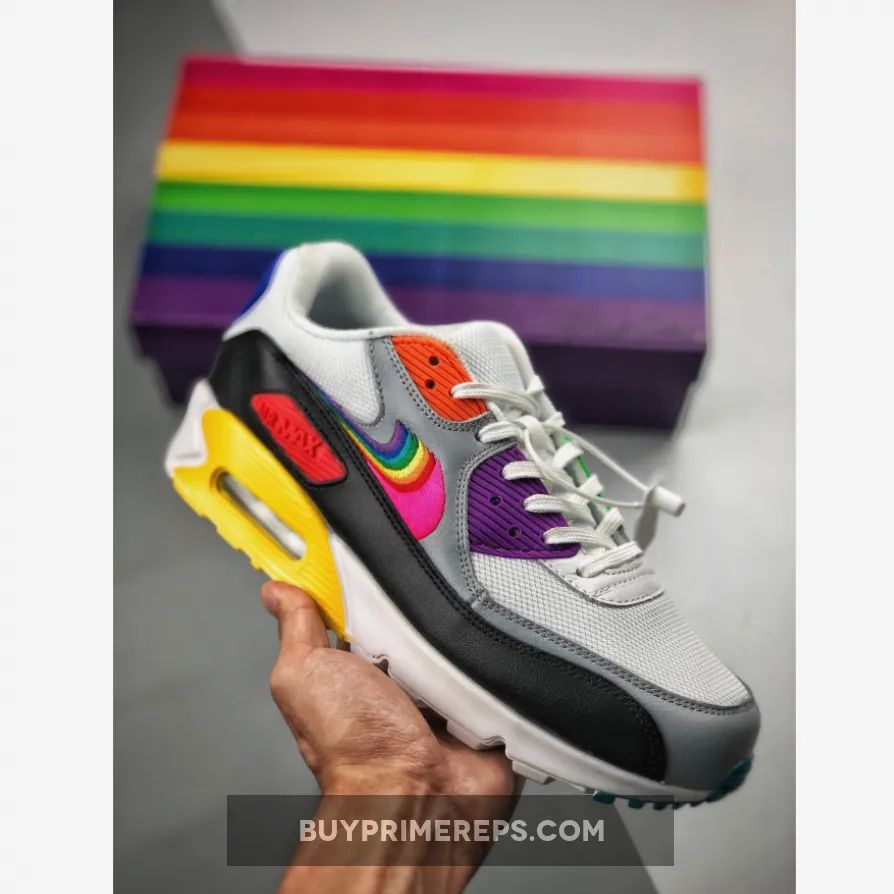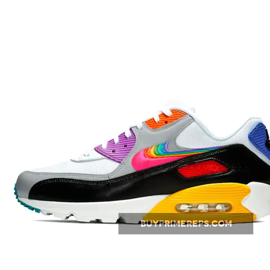 The upper of the Air Max 90 Be True features a combination of white mesh, black overlays, and grey accents. These monochrome tones serve as the perfect backdrop for the rainbow panels that steal the show. The shoe comes to life with pops of orange, purple, red, blue, and yellow on the plastic overlays, creating a bold and eye-catching look.