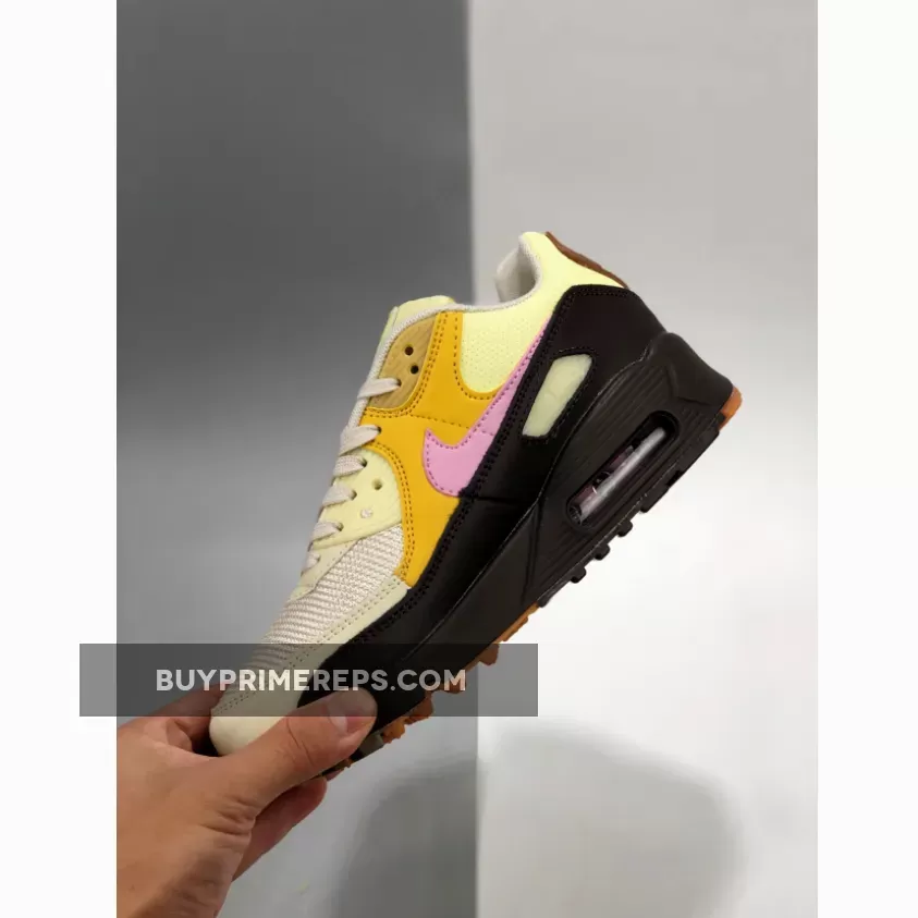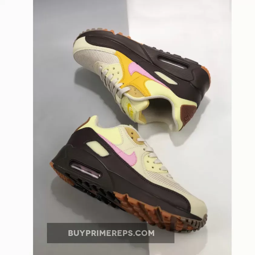The upper of the Air Max 90 Cuban Link Velvet Brown Pink is dressed in neutral hues, with a premium brown suede mudguard that sits just above the dark brown midsole. The earthy tones continue throughout the sneaker, with cream mesh covering the toe box and a light pastel yellow brightening up the heel and lace unit. The addition of pastel pink Swooshes on the sidewalls adds a pop of color, perfectly complementing the pink-tinted visible Air bubble in the heel of the midsole.