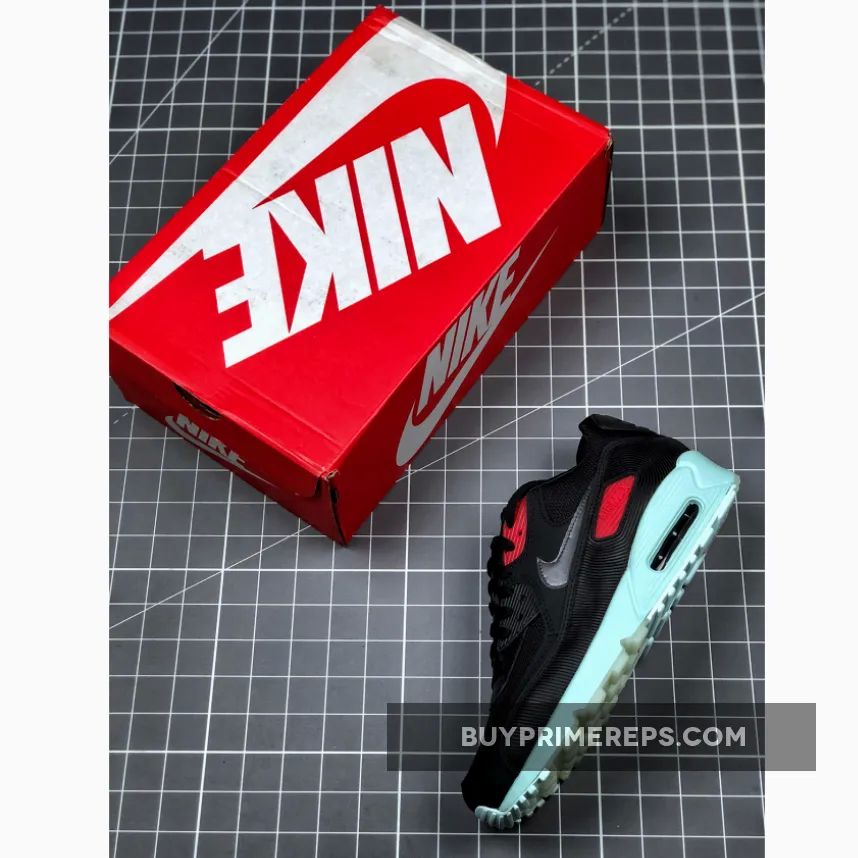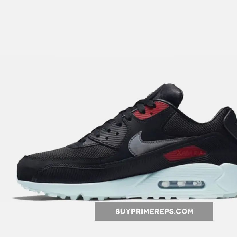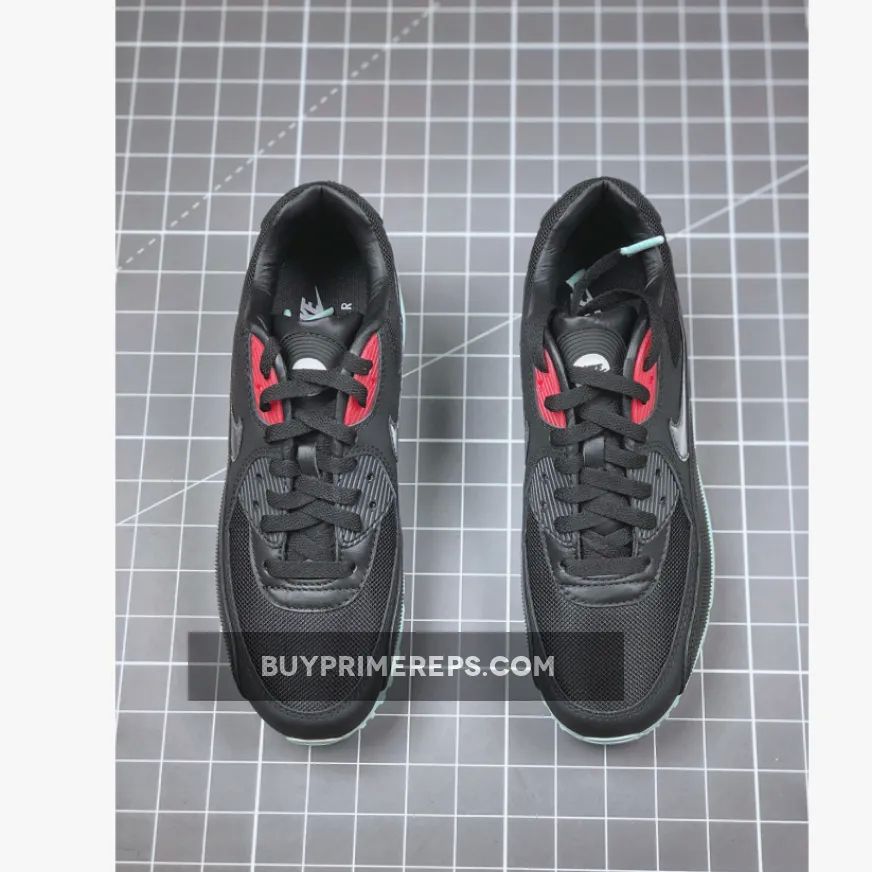 The Air Max 90 Vinyl features a black color scheme, with a combination of mesh, nubuck, and leather materials on the upper. The black base is complemented by red accents, adding a pop of color and creating a stylish contrast. One of the standout features of this shoe is the vinyl tongue tabs, which are branded with the Nike logo in the center. These tabs resemble the grooves found on a vinyl record, adding a unique and eye-catching element to the design.
