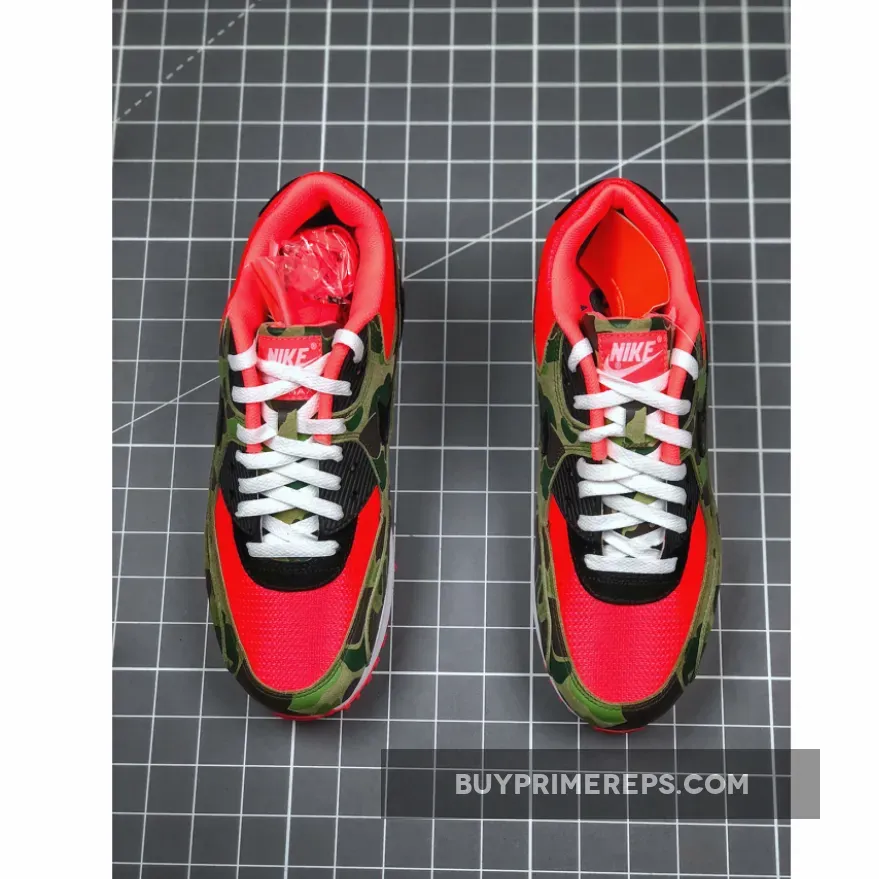 The upper of the Air Max 90 Reverse Duck Camo is constructed with a vibrant infrared hue, giving it a bold and eye-catching look. The iconic Duck Camo print is layered over the infrared panels, adding a touch of camouflage-inspired style to the design. The camo pattern is reminiscent of the 2013 colorway, paying homage to the past while offering a fresh take on the classic silhouette.